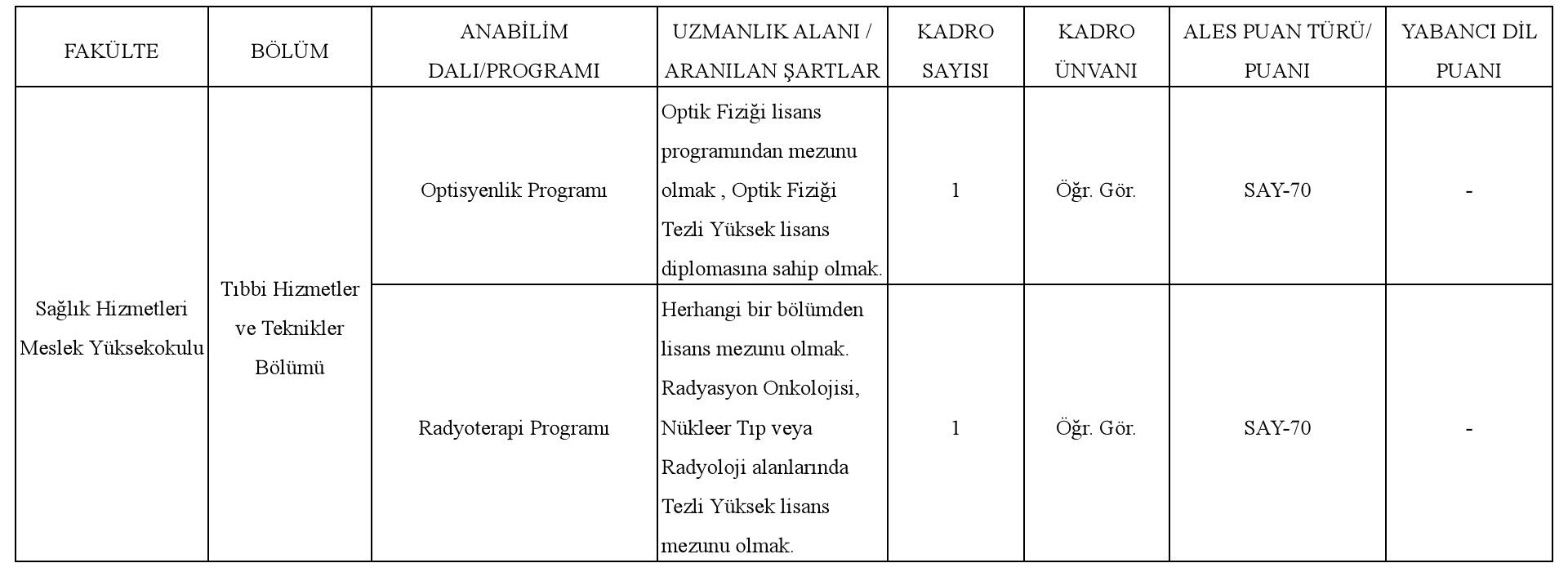 Üniversitemize 2547 sayılı Yükseköğretim Kanunu'nun ve 09.11.2018 tarihli, 30590 sayılı Resmi Gazete'de yayımlanan Öğretim Üyesi Dışındaki Öğretim Elemanı Kadrolarına Yapılacak Atamalarda Uygulanacak Merkezi Sınav ile Giriş Sınavlarına İlişkin Usul ve Esaslar Hakkında Yönetmeliği'nin ilgili maddeleri uyarınca "Öğretim Elemanı" alınacaktır.