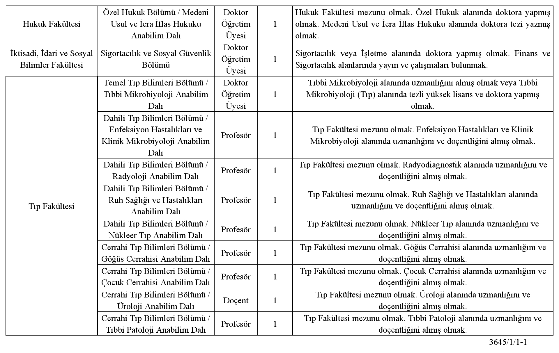 Üniversitemize 2547 Sayılı Kanun'un ilgili maddeleri ile Öğretim Üyeliğine Yükseltilme ve Atanma Yönetmeliği'nin ilgili maddeleri uyarınca aşağıdaki tabloda belirtilen Fakülte bünyesine tam zamanlı öğretim üyesi alınacaktır.
