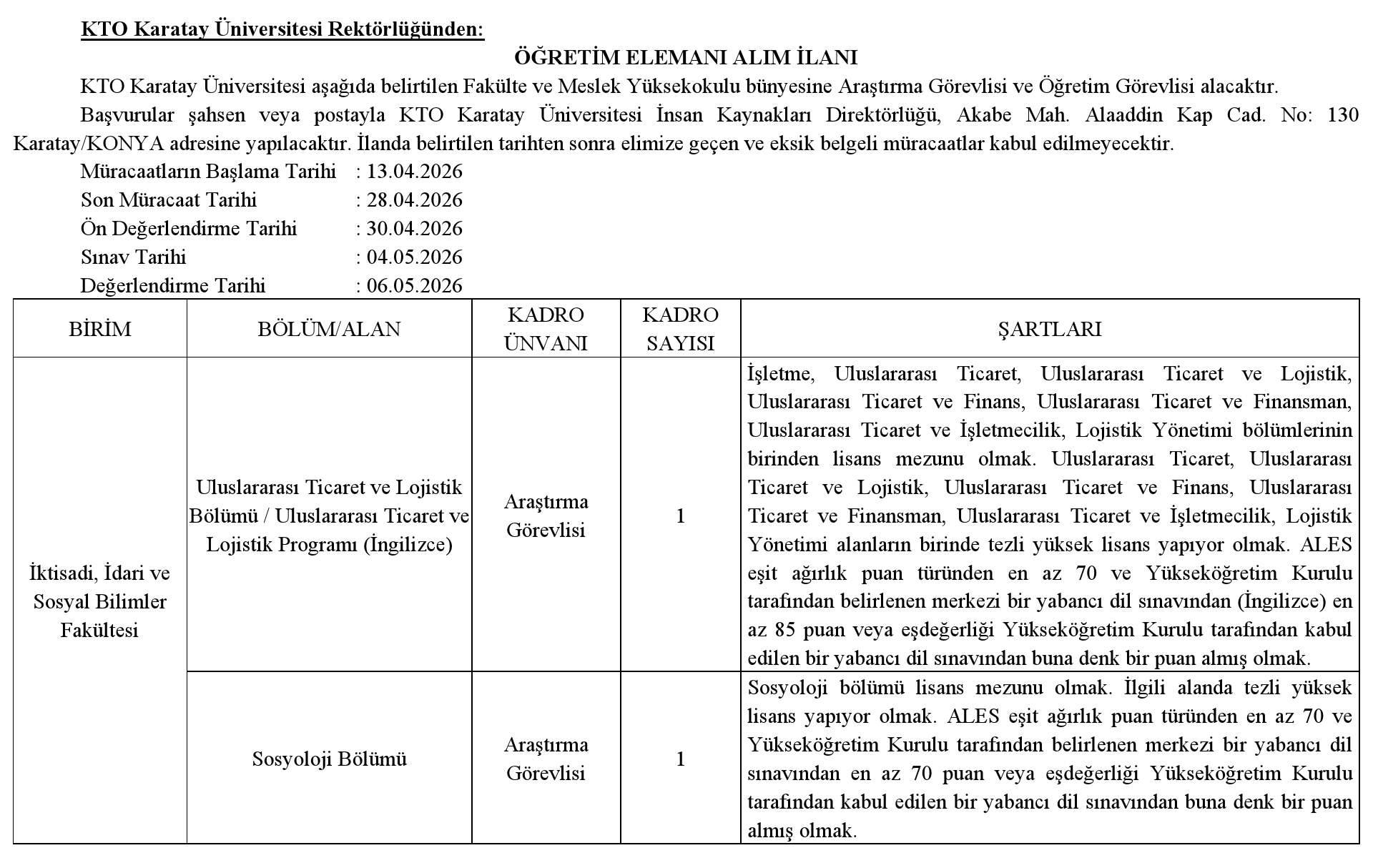 KTO Karatay Üniversitesi Öğretim Üyesi ve Elemanı Alım İlanı. Son başvuru tarihi 28 Nisan 2026