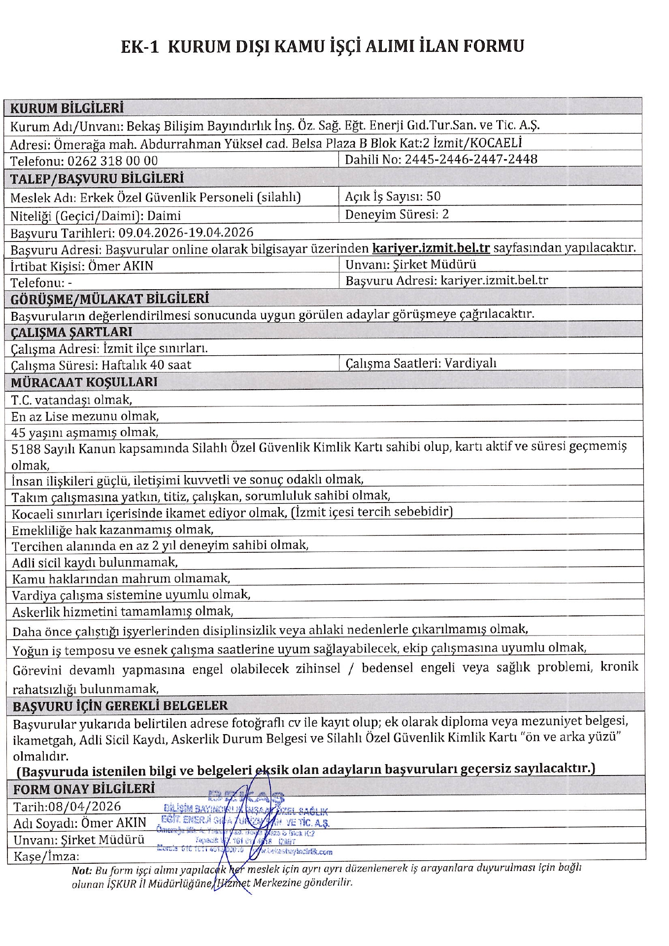 Ana sayfaDaimi İşçi İlanları Kocaeli Bekaş Bilişim 50 İşçi Alacak Kocaeli Bekaş Bilişim 50 İşçi Alacak. Son başvuru tarihi 19 Nisan 2026 Kaynak : İşkur İlan Giriş : 13 Nisan 2026 22:39, Son Güncelleme : 13 Nisan 2026 23:21 Yazdır Yorumlar (0) Abone Ol