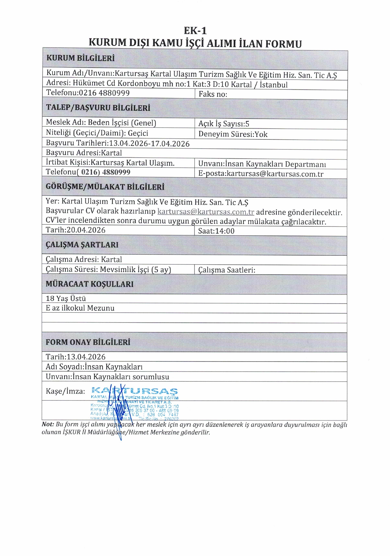 Ana sayfaGeçici İşçi İlanları İstanbul Kartursaş 5 İşçi Alacak İstanbul Kartursaş 5 İşçi Alacak. Son başvuru tarihi 17 Nisan 2026 Kaynak : İşkur İlan Giriş : 13 Nisan 2026 22:47, Son Güncelleme : 13 Nisan 2026 23:18 Yazdır Yorumlar (0) Abone Ol