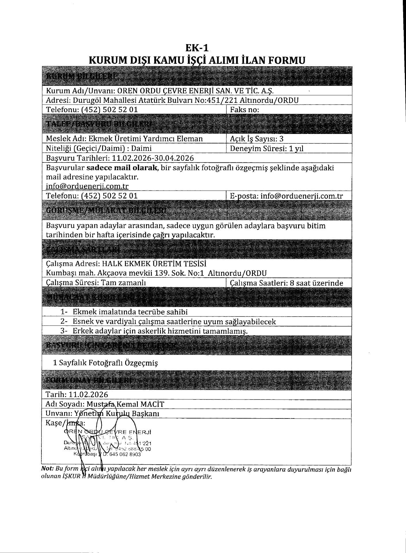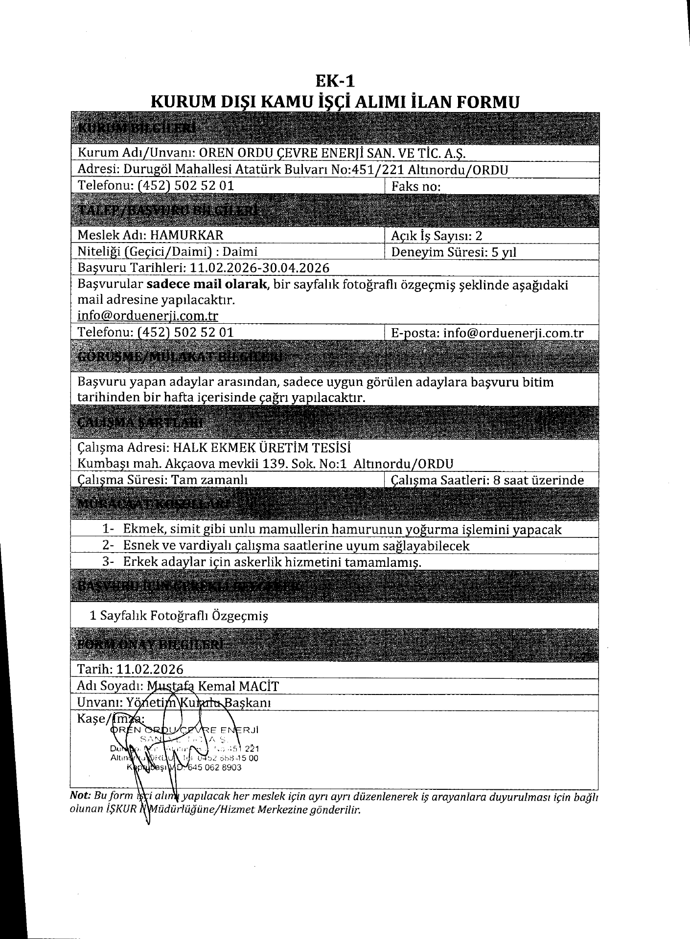 Ordu Ören Çevre Enerji 5 İşçi Alacak. Son başvuru tarihi 30 Nisan 2026