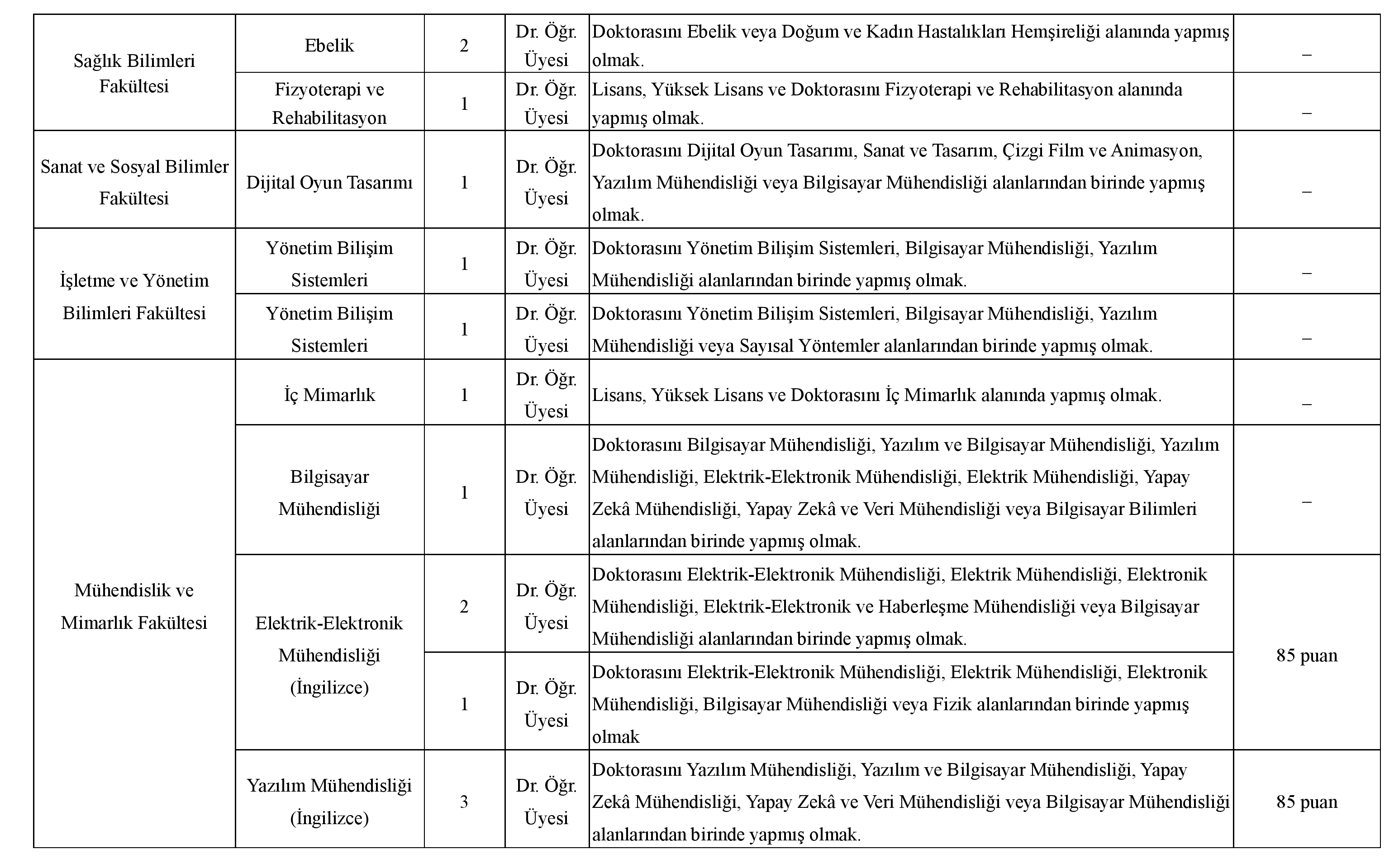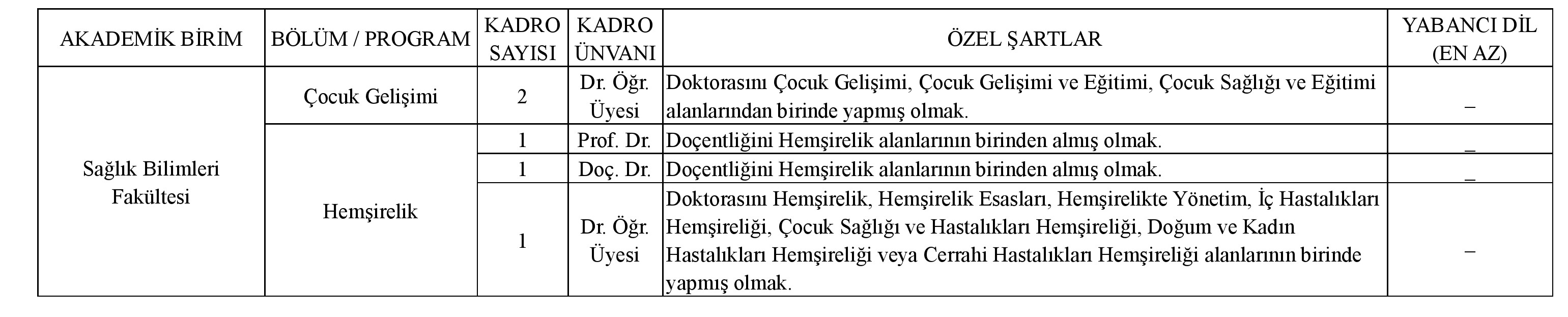 Üniversitemizin aşağıdaki tabloda belirtilen akademik birimlerine, 657 sayılı Devlet Memurları Kanunu'nun 48'inci maddesinde belirtilen genel şartları taşıyan, 2547 sayılı Yükseköğretim Kanunu ile Öğretim Üyeliğine Yükseltilme ve Atanma Yönetmeliği'nin ilgili maddeleri uyarınca öğretim üyesi alınacaktır. Başvuracak adayların, söz konusu kanun ve yönetmelik kapsamındaki şartları taşıması ve istenen belgeleri tamamlaması gerekmektedir.