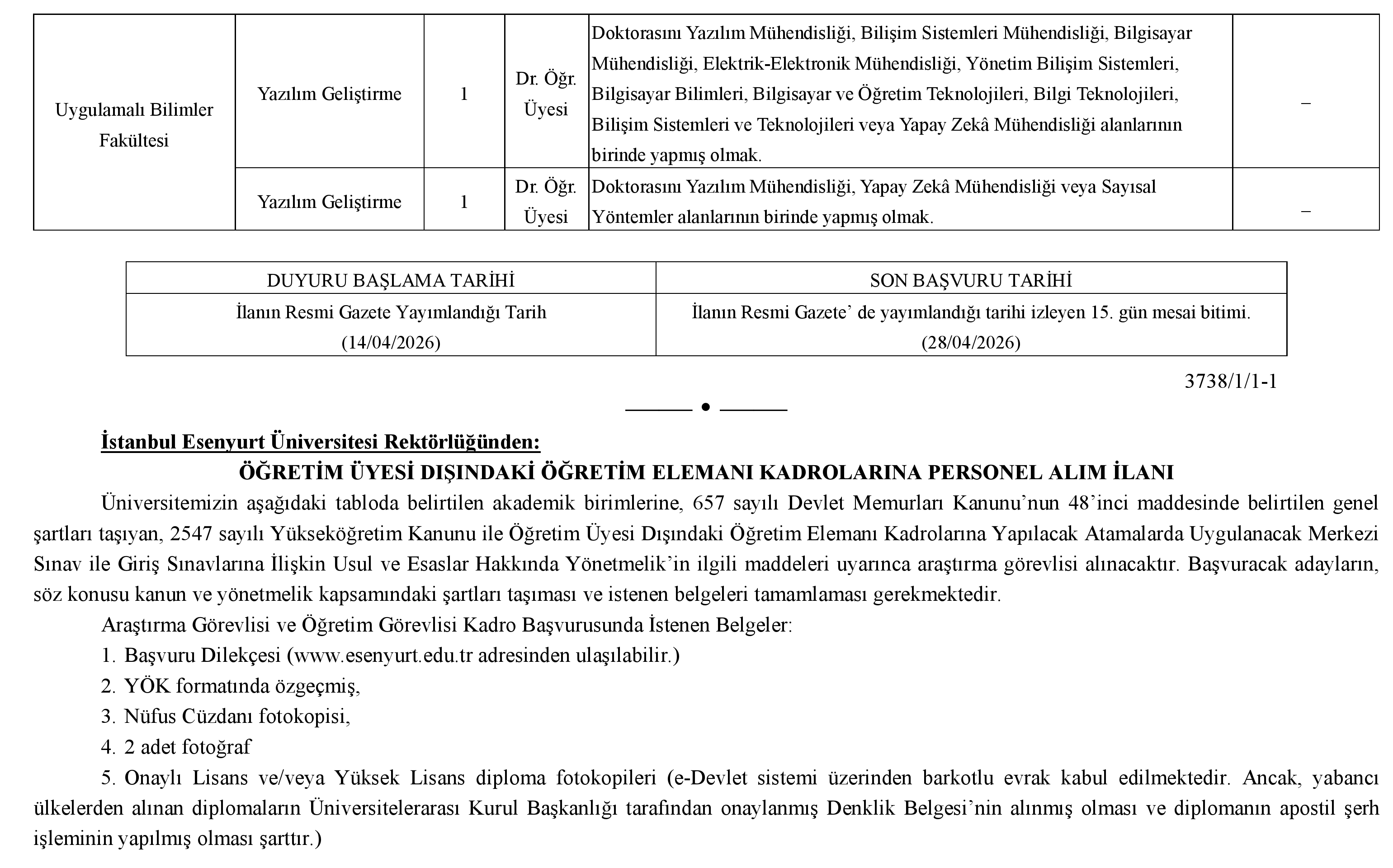 İstanbul Esenyurt Üniversitesi Öğretim Üyesi ve Elemanı Alım İlanı. Son başvuru tarihi 28 Nisan 2026