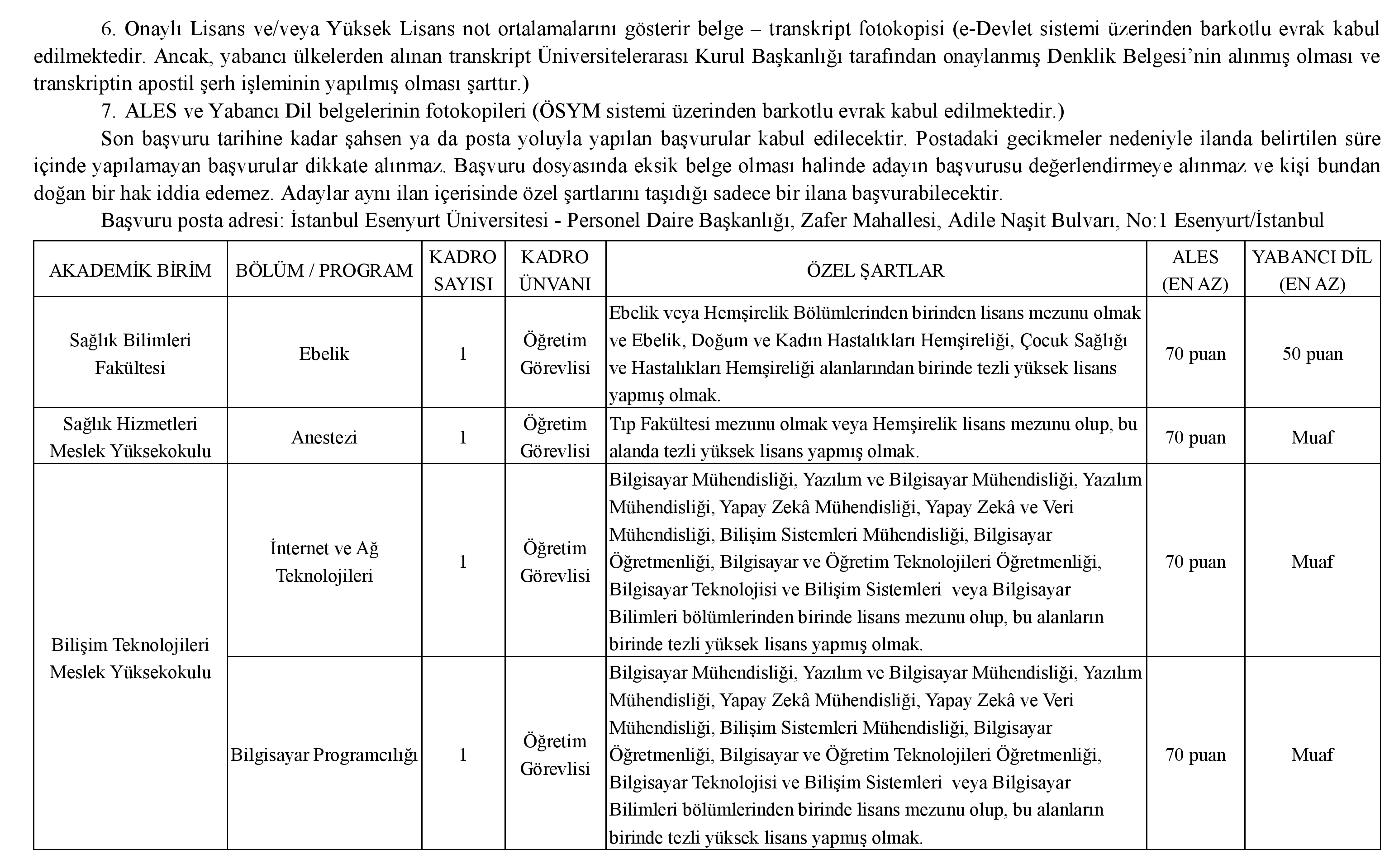Başvuru posta adresi: İstanbul Esenyurt Üniversitesi - Personel Daire Başkanlığı, Zafer Mahallesi, Adile Naşit Bulvarı, No:1 Esenyurt/İstanbul
