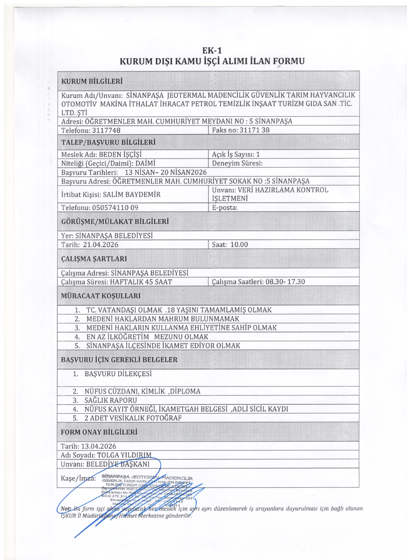 Ana sayfaDaimi İşçi İlanları Afyonkarahisar Sinanpaşa Jeotermal 1 İşçi Alacak Afyonkarahisar Sinanpaşa Jeotermal 1 İşçi Alacak. Son başvuru tarihi 20 Nisan 2026 Kaynak : İşkur İlan Giriş : 14 Nisan 2026 22:59, Son Güncelleme : 14 Nisan 2026 23:27 Yazdır Yorumlar (0) Abone Ol