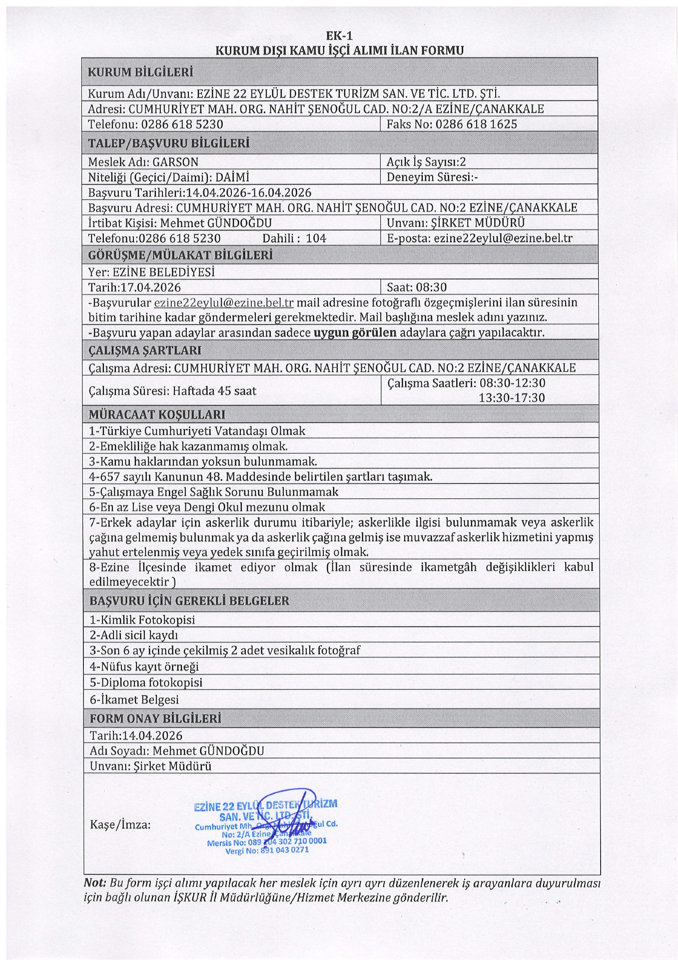 Ana sayfaDaimi İşçi İlanları Çanakkale Ezine 22 Eylül Destek Turizm 2 İşçi Alacak Çanakkale Ezine 22 Eylül Destek Turizm 2 İşçi Alacak. Son başvuru tarihi 16 Nisan 2026 Kaynak : İşkur İlan Giriş : 14 Nisan 2026 23:03, Son Güncelleme : 14 Nisan 2026 23:26 Yazdır Yorumlar (0) Abone Ol