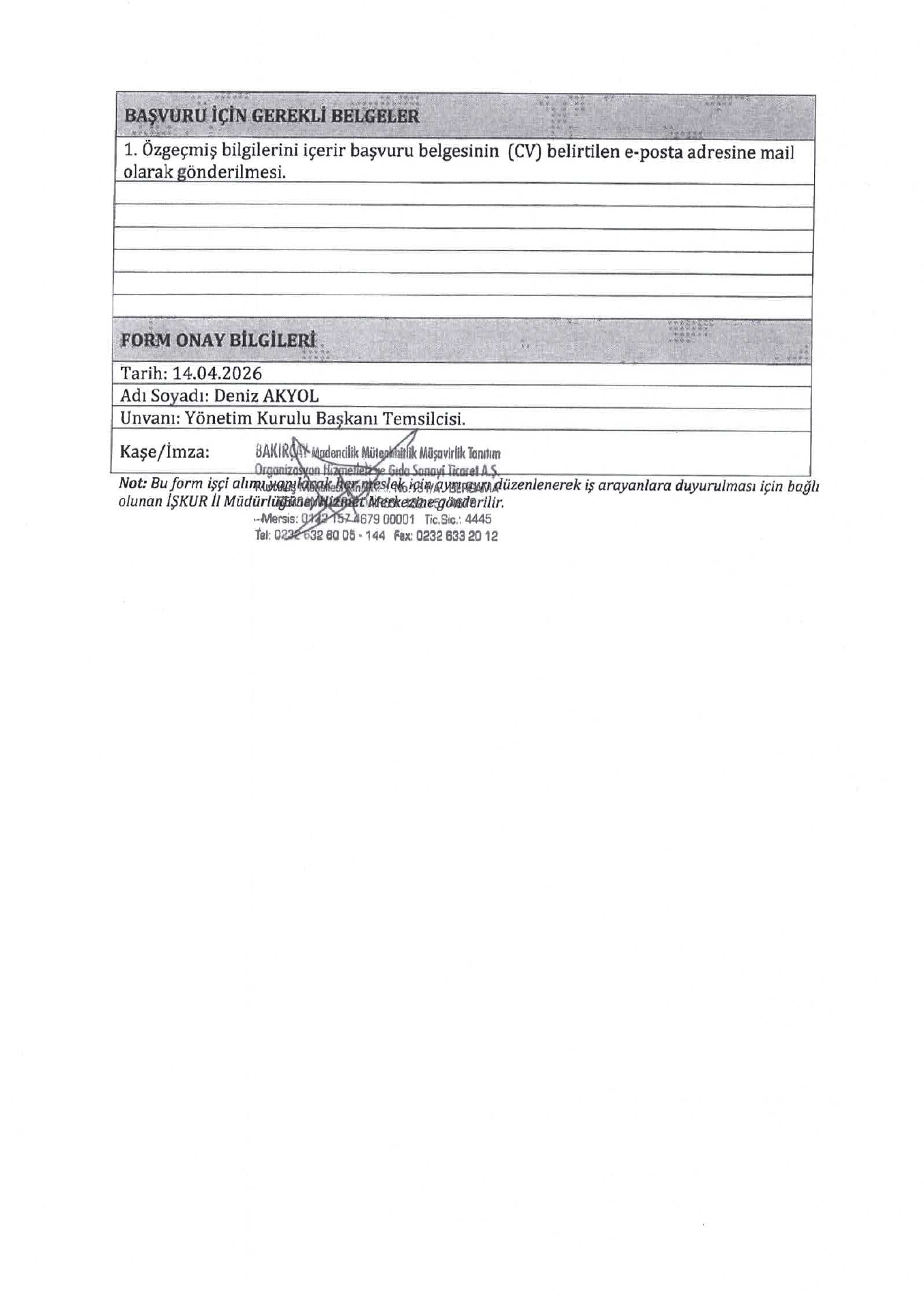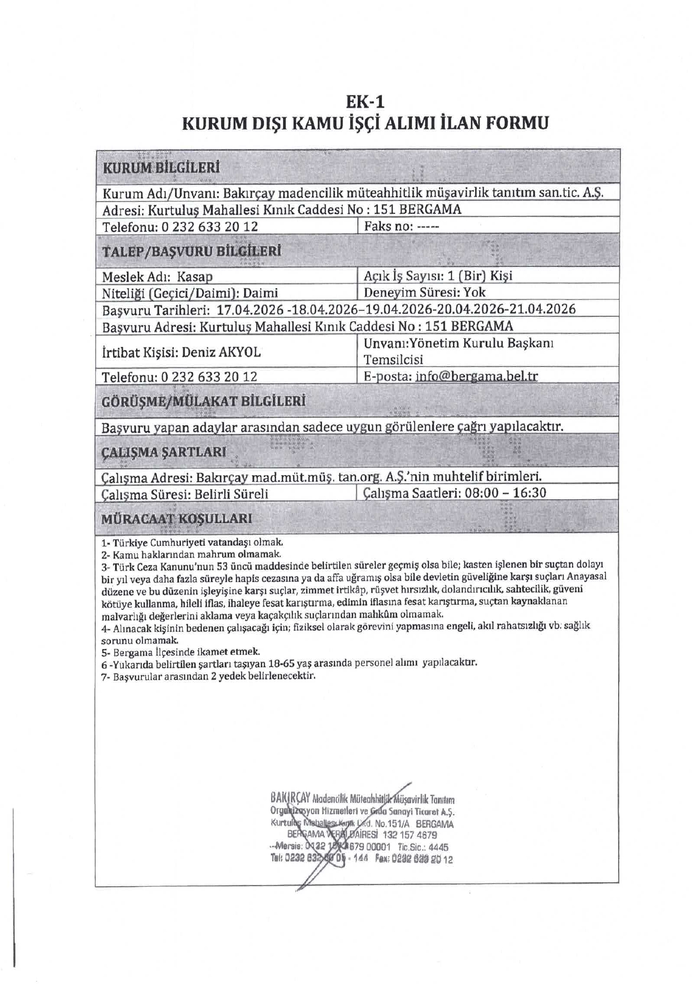 Ana sayfaDaimi İşçi İlanları İzmir Bakırçay Madencilik 1 İşçi Alacak İzmir Bakırçay Madencilik 1 İşçi Alacak. Son başvuru tarihi 18 Nisan 2026 Kaynak : İşkur İlan Giriş : 15 Nisan 2026 23:06, Son Güncelleme : 15 Nisan 2026 23:19 Yazdır Yorumlar (0) Abone Ol