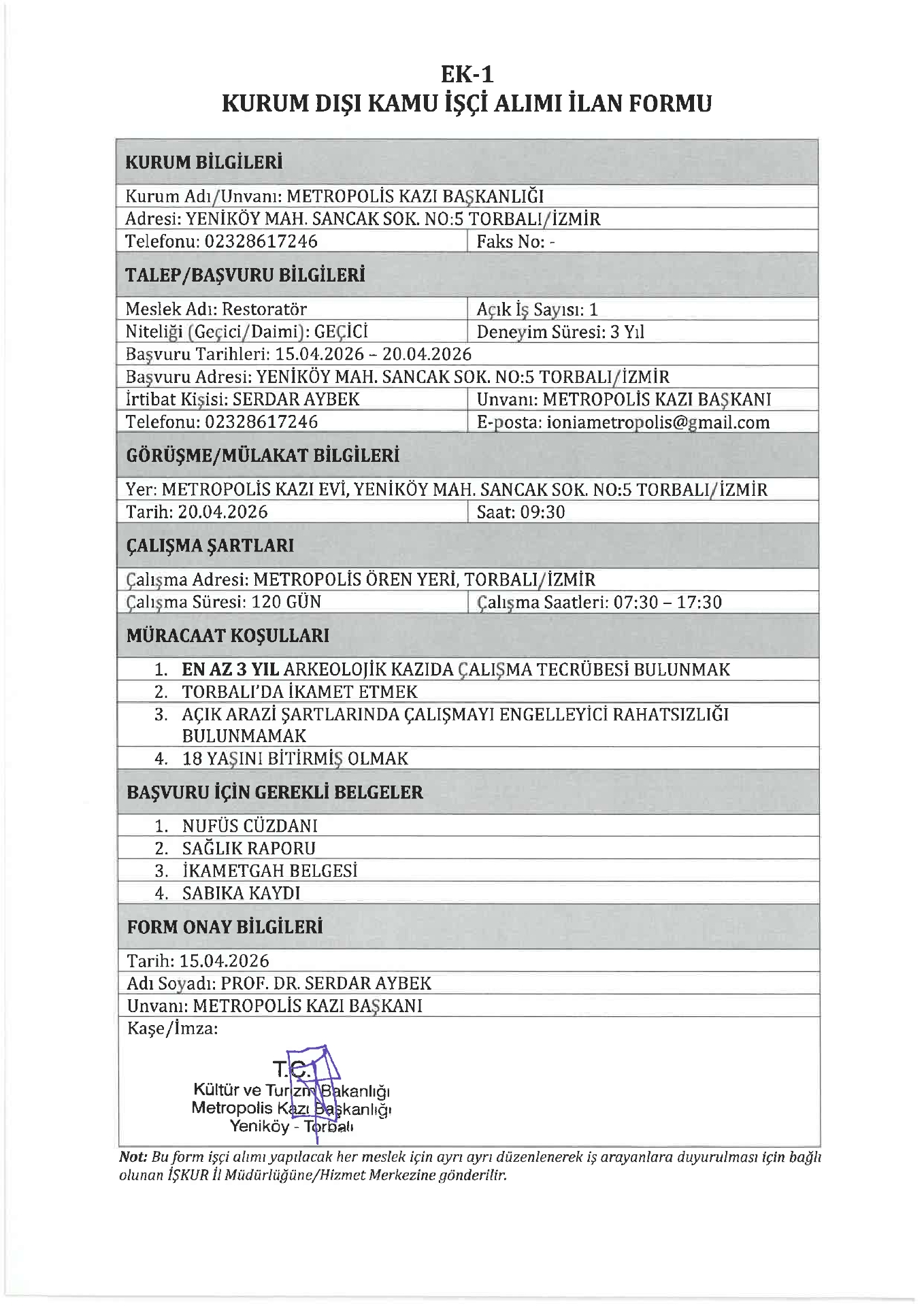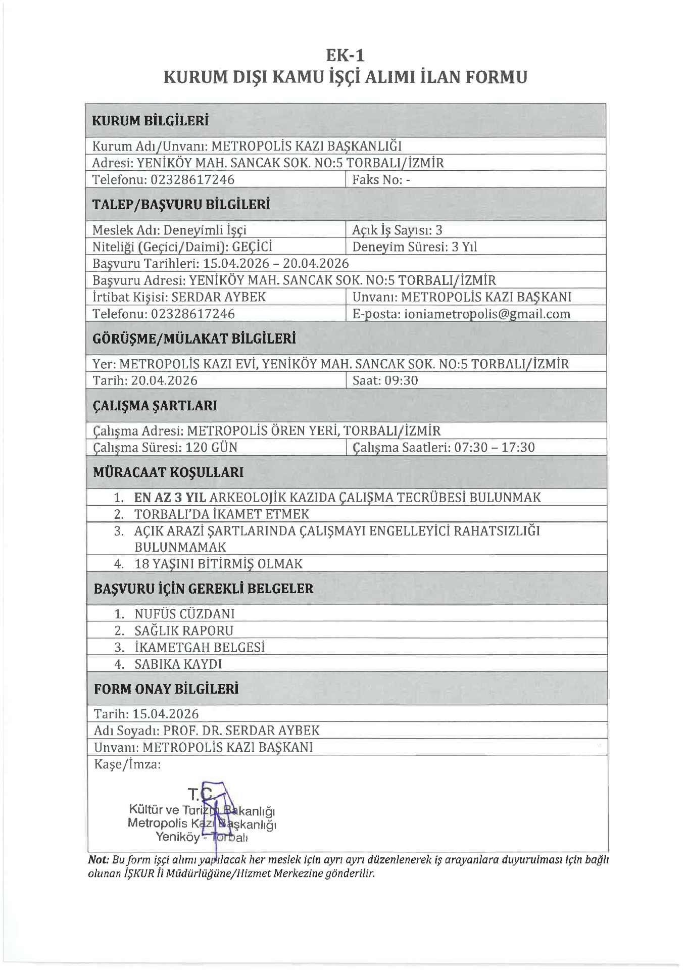 İzmir Metropolis Kazı Başkanlığı Geçici 4 İşçi Alacak. Son başvuru tarihi 20 Nisan 2026