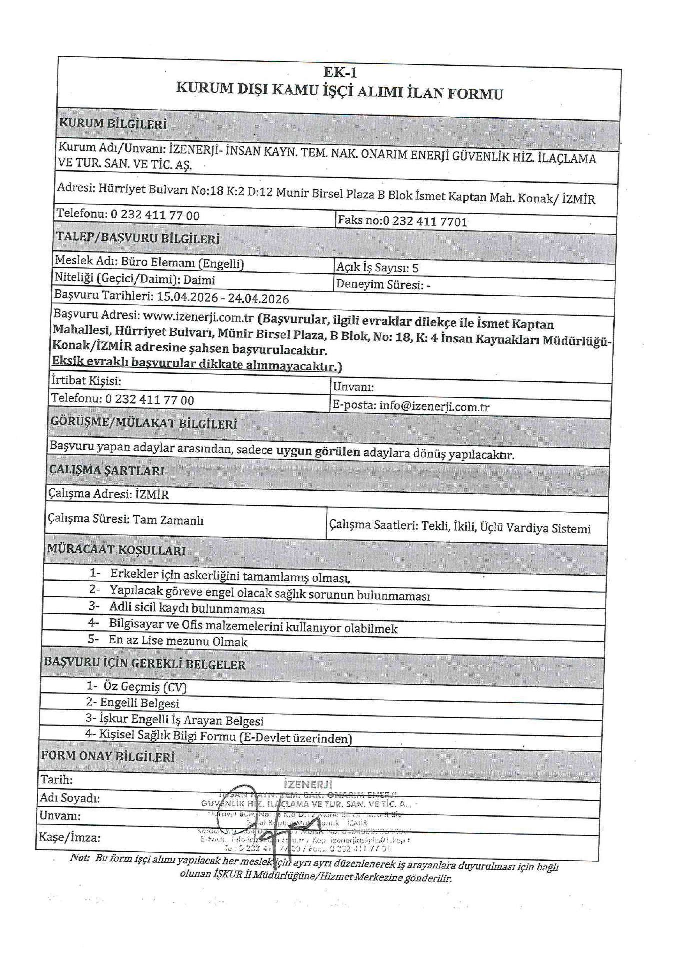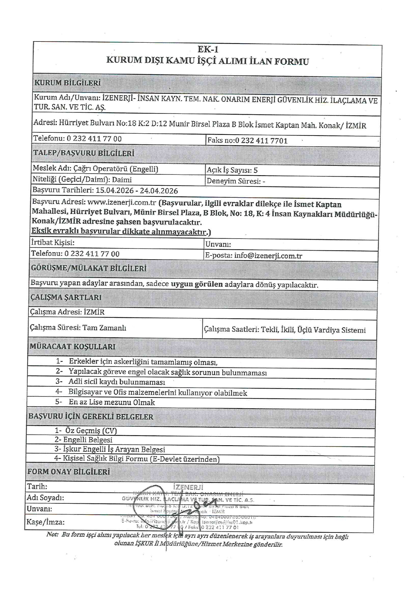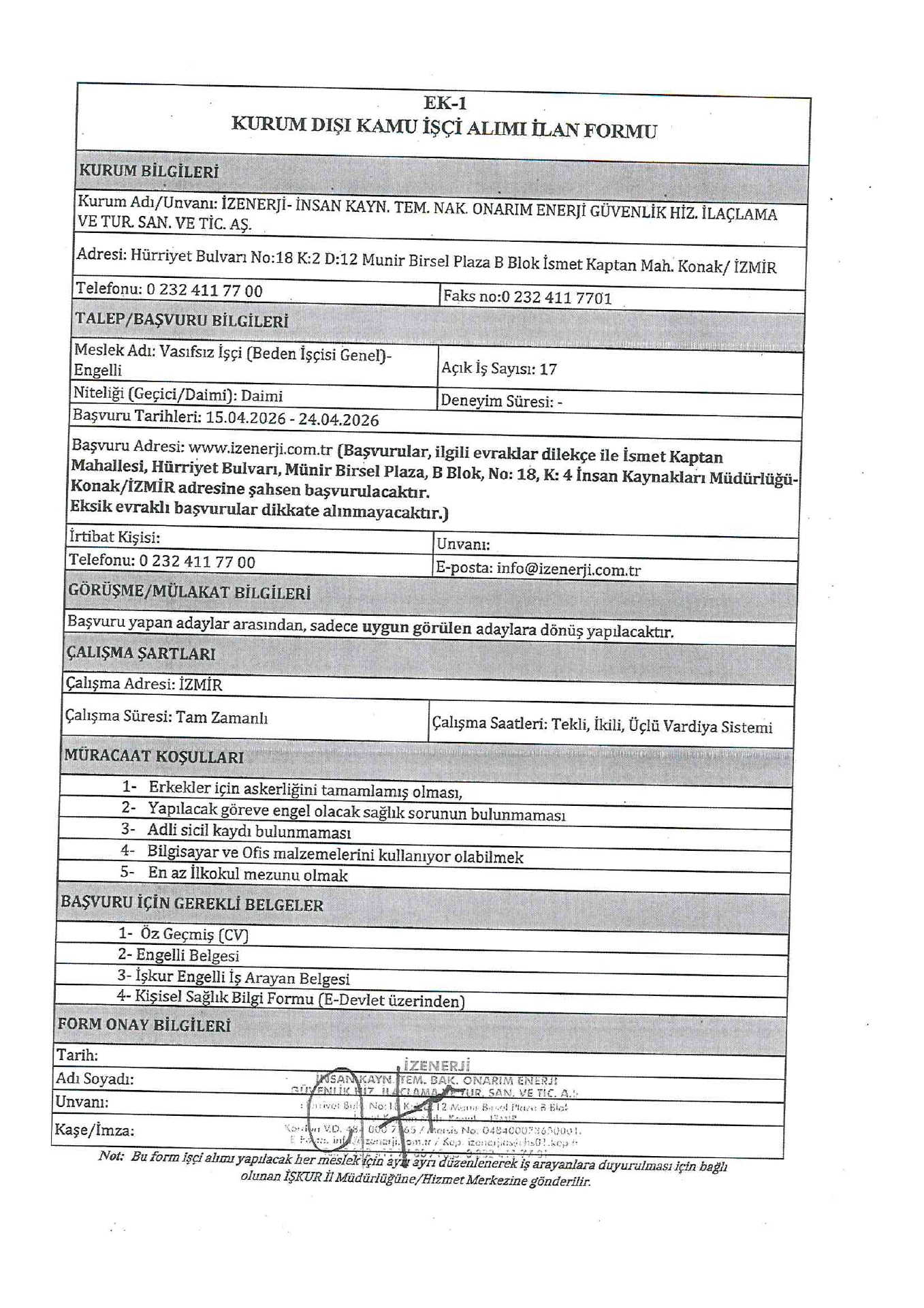 Ana sayfaDaimi İşçi İlanları İzmir İzenerji Engelli 60 İşçi Alacak İzmir İzenerji Engelli 60 İşçi Alacak. Son başvuru tarihi 24 Nisan 2026 Kaynak : İşkur İlan Giriş : 15 Nisan 2026 23:20, Son Güncelleme : 15 Nisan 2026 23:16 Yazdır Yorumlar (0) Abone Ol