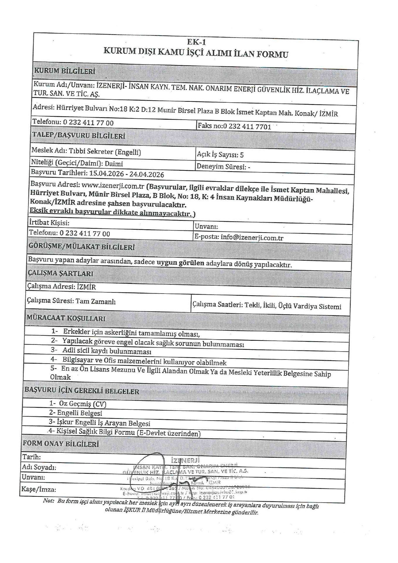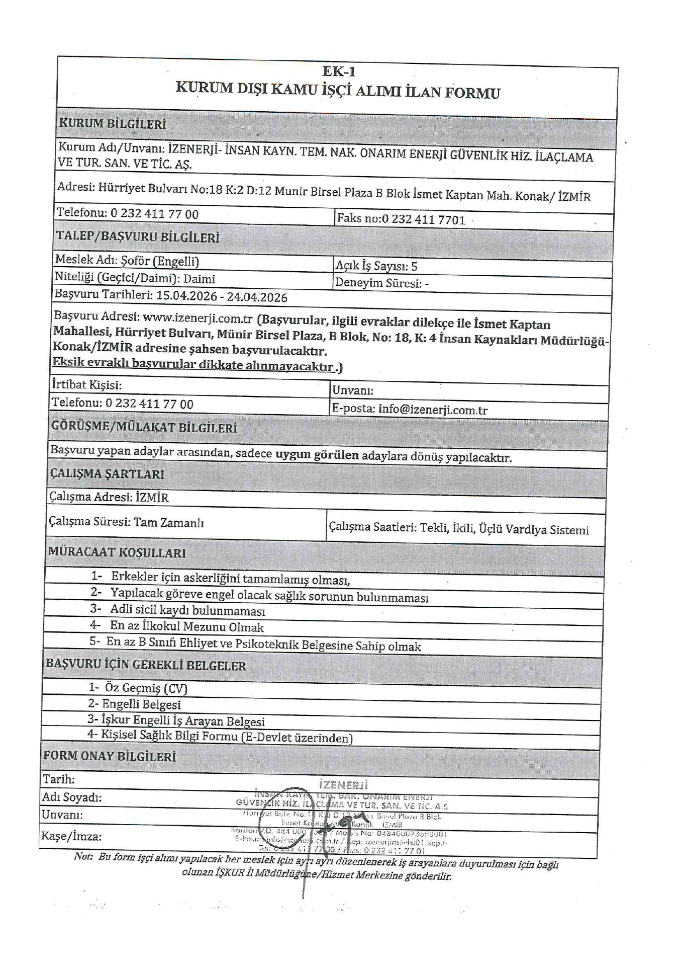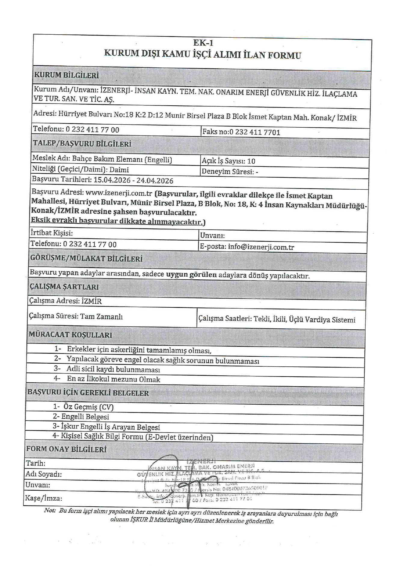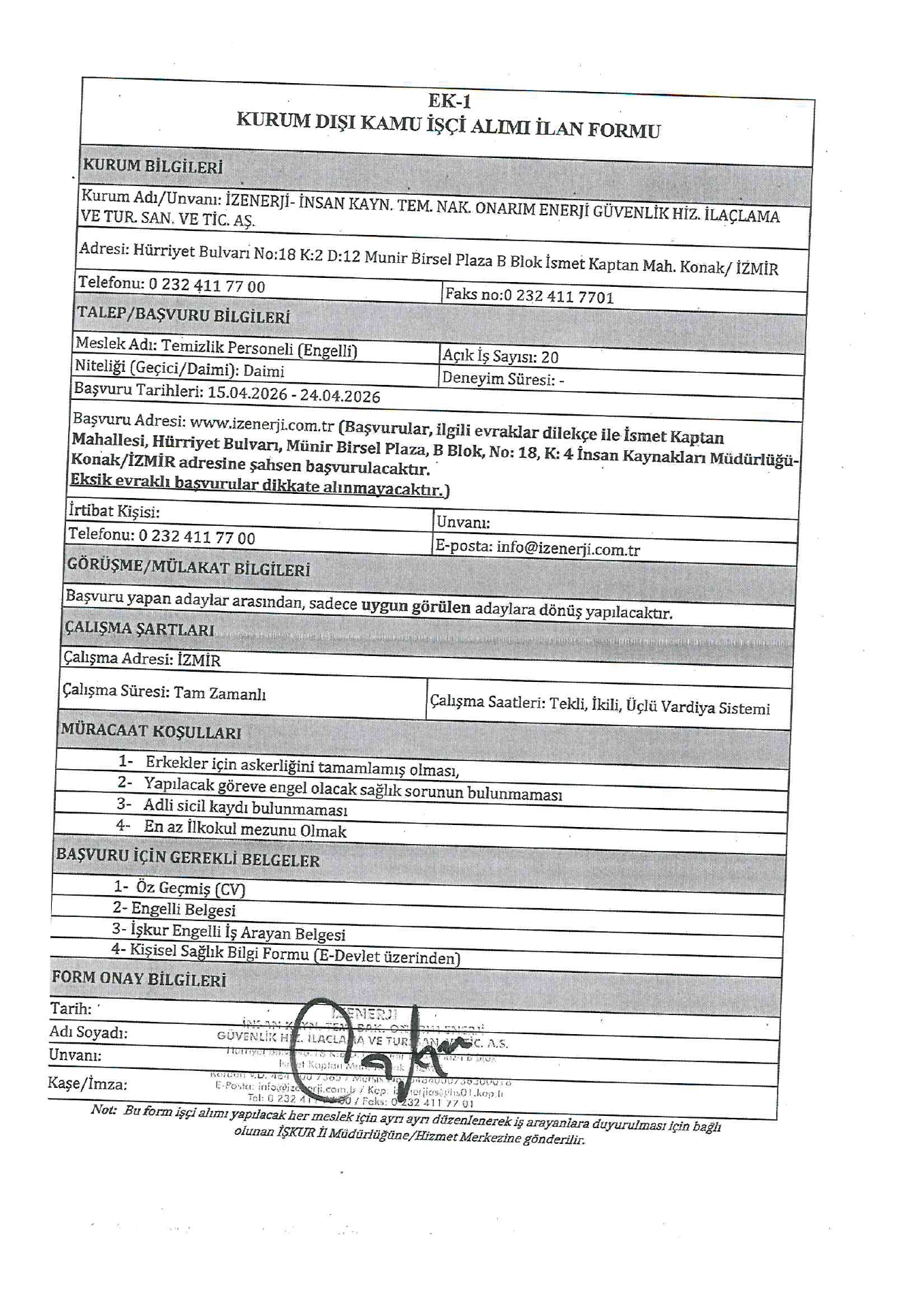 Ana sayfaDaimi İşçi İlanları İzmir İzenerji Engelli 60 İşçi Alacak İzmir İzenerji Engelli 60 İşçi Alacak. Son başvuru tarihi 24 Nisan 2026 Kaynak : İşkur İlan Giriş : 15 Nisan 2026 23:20, Son Güncelleme : 15 Nisan 2026 23:16 Yazdır Yorumlar (0) Abone Ol