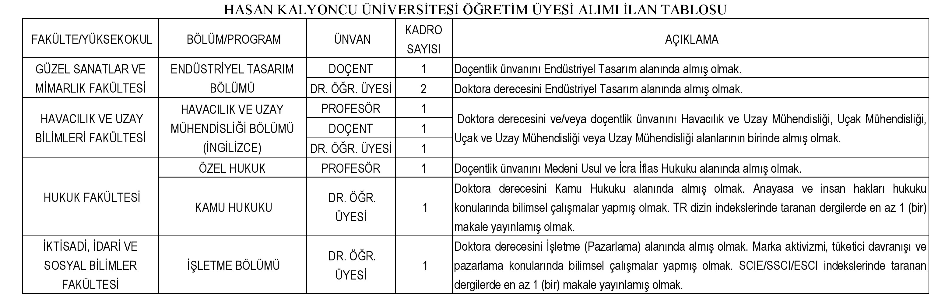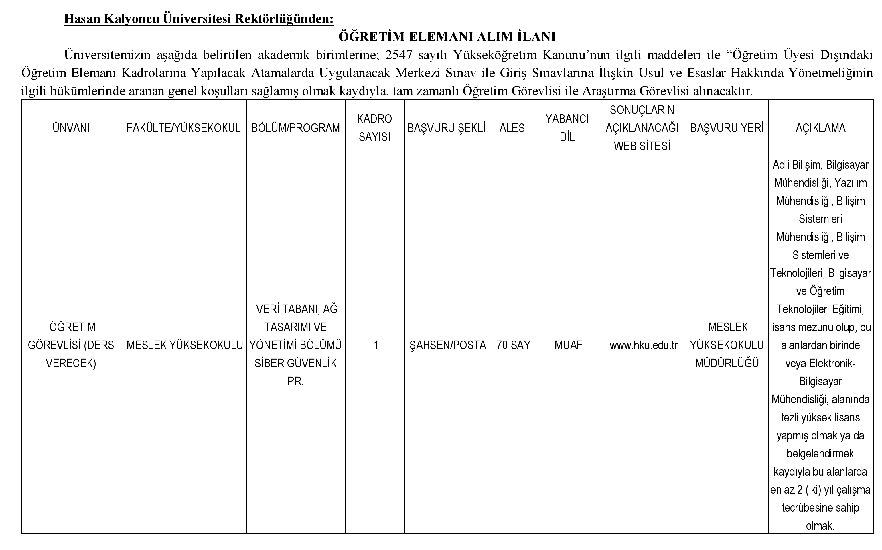 Hasan Kalyoncu Üniversitesi Öğretim Üyesi ve Elemanı Alım İlanı. Son başvuru tarihi 4 Mayıs 2026