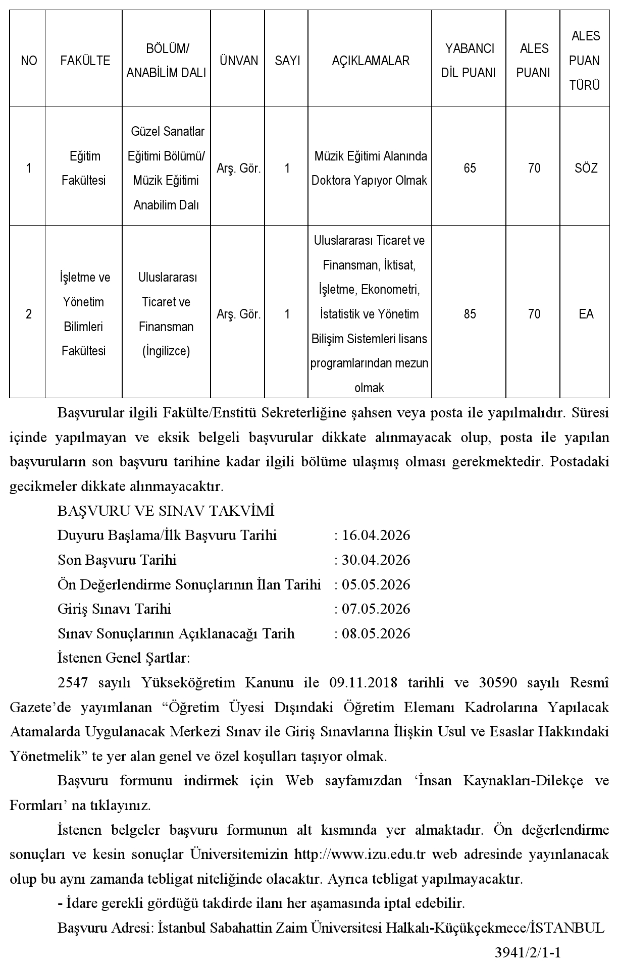 İstanbul Sabahattin Zaim Üniversitesi Öğretim Üyesi ve Elemanı Alım İlanı. Son başvuru tarihi 30 Nisan 2026