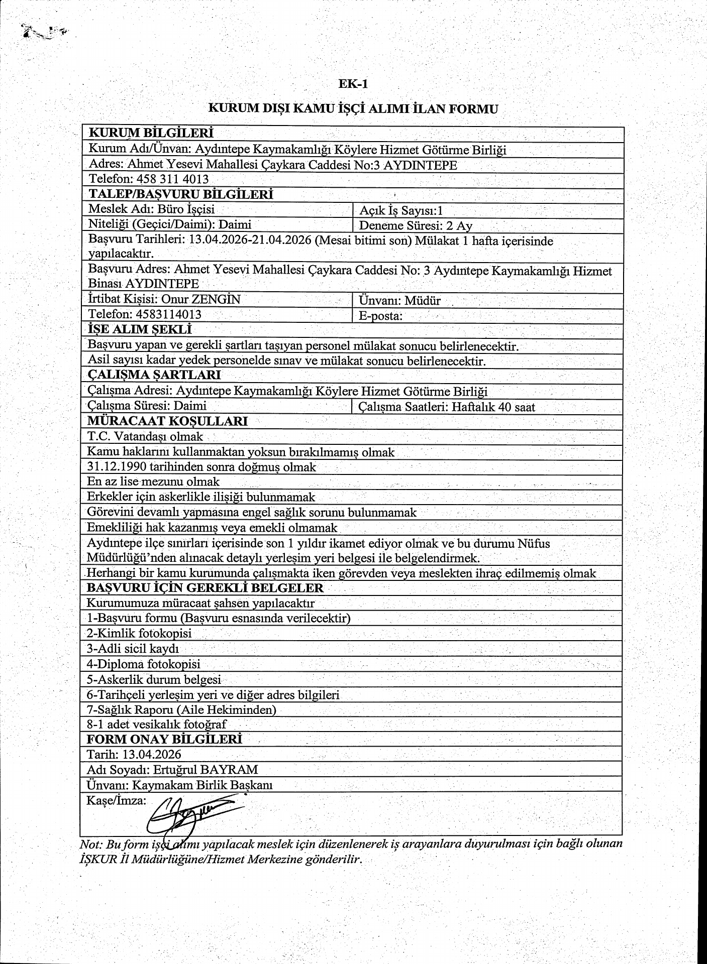 Aydıntepe Kaymakamlığı Köylere Hizmet Götürme Birliği 1 İşçi Alacak. Son başvuru tarihi 21 Nisan 2026