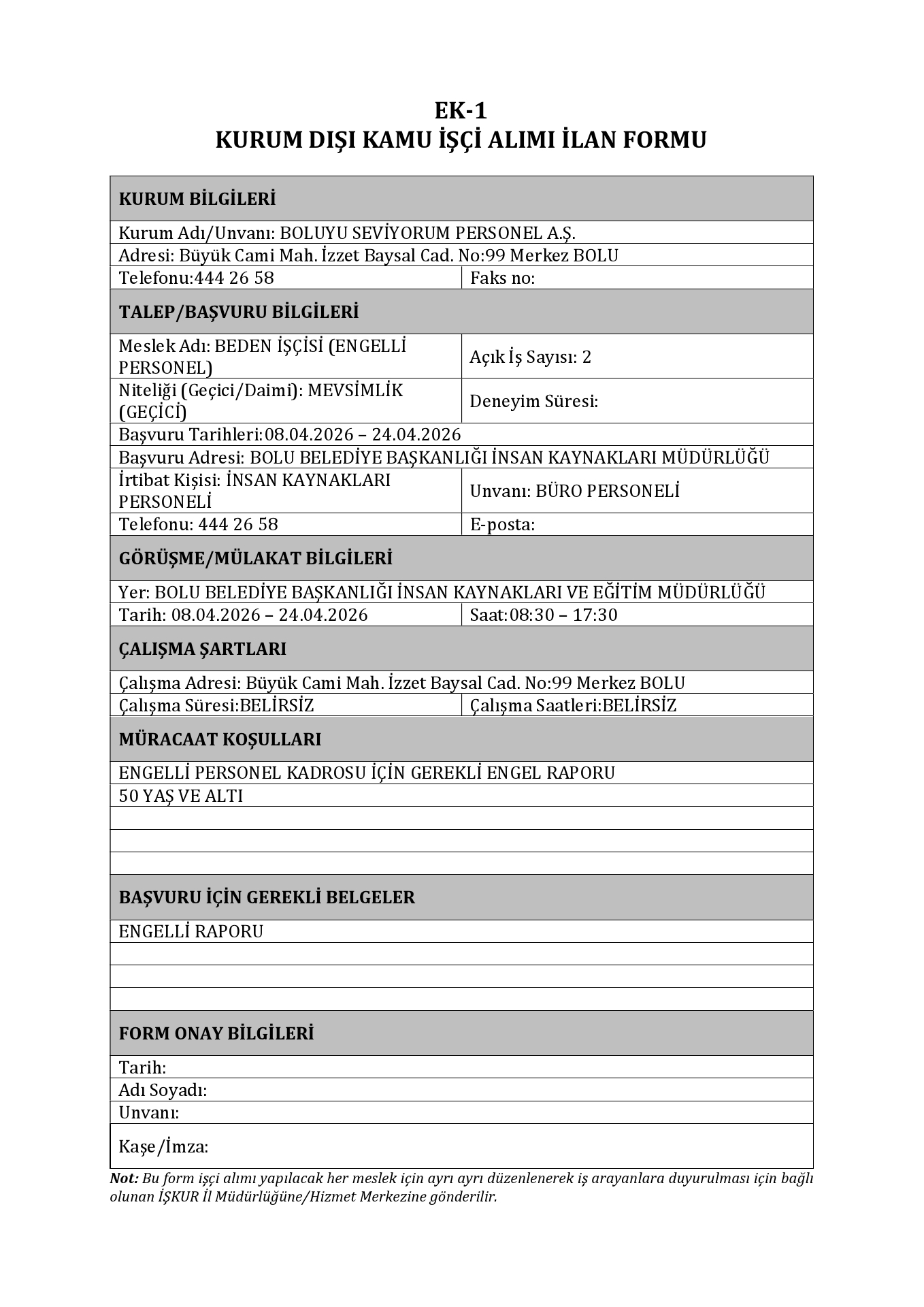 Bolu Boluyu Seviyorum Personel AŞ. Geçici 2 İşçi Alacak. Son başvuru tarihi 24 Nisan 2026
