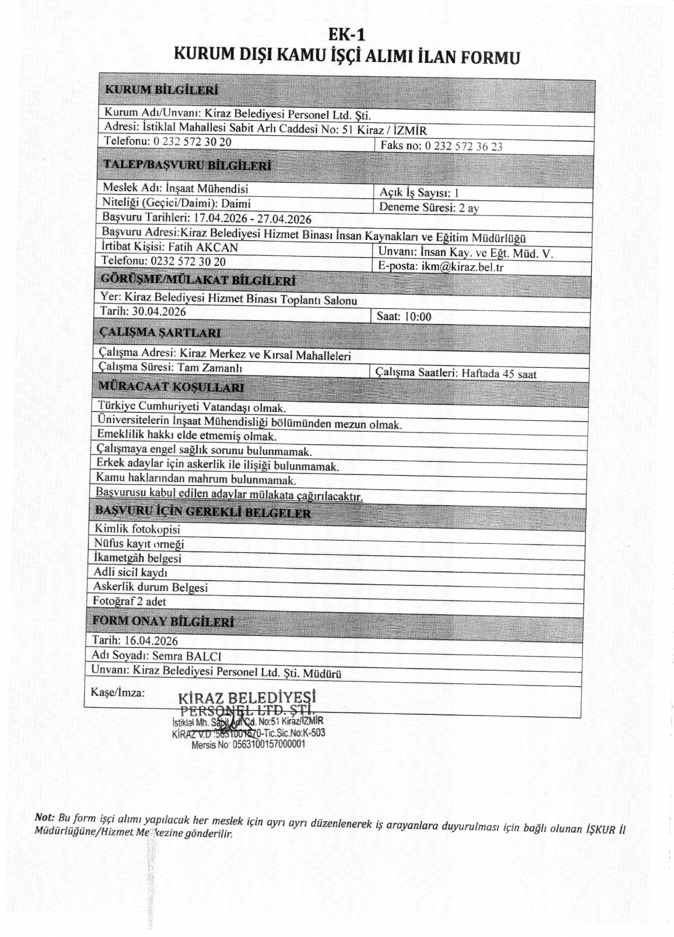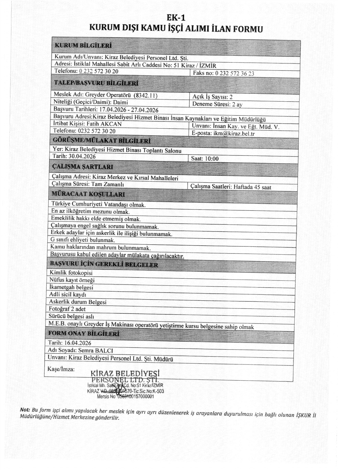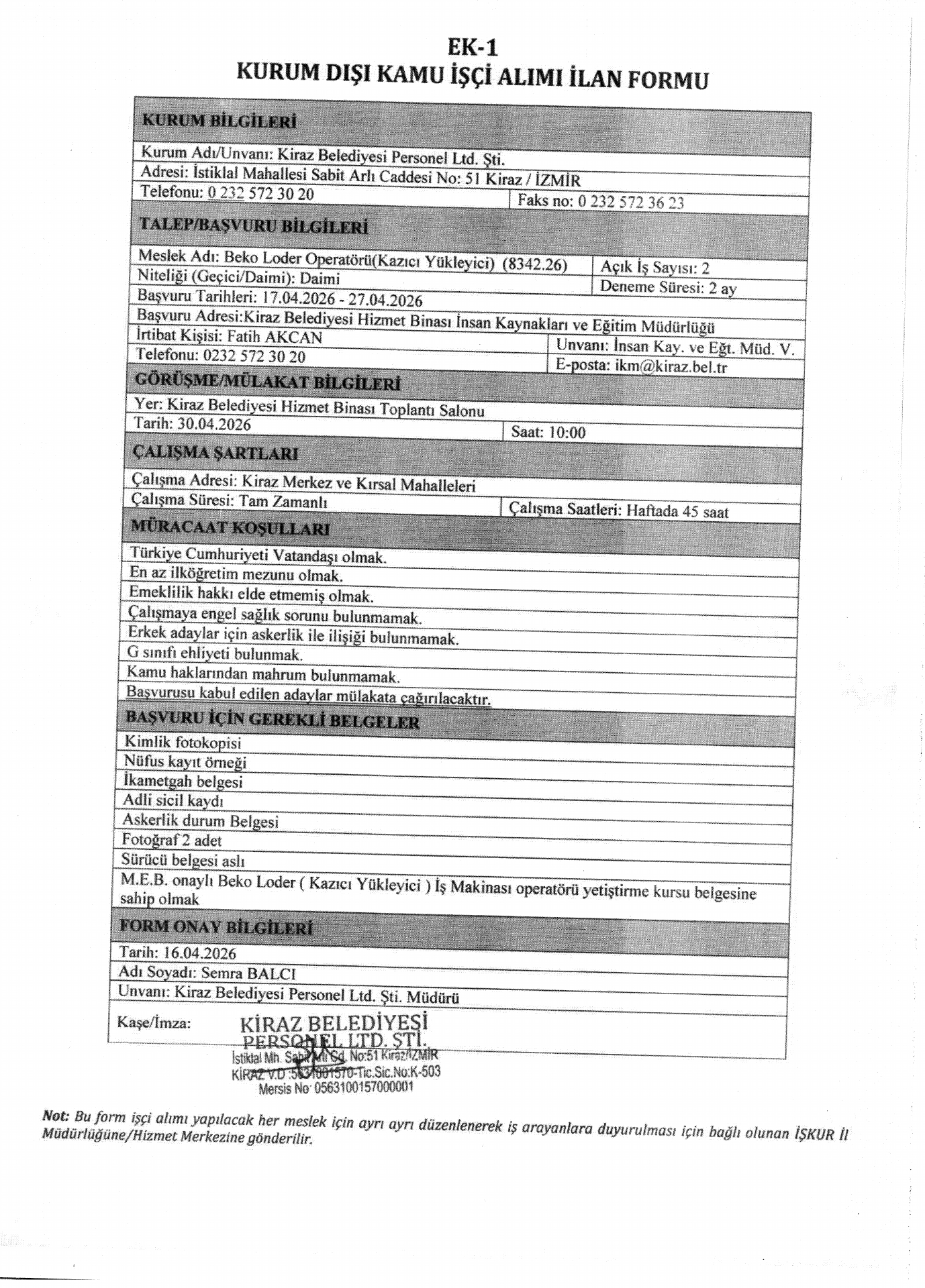 Ana sayfaDaimi İşçi İlanları İzmir Kiraz Belediyesi 6 İşçi Alacak İzmir Kiraz Belediyesi 6 İşçi Alacak. Son başvuru tarihi 27 Nisan 2026 Kaynak : İşkur İlan Giriş : 17 Nisan 2026 23:18, Son Güncelleme : 17 Nisan 2026 23:36 Yazdır Yorumlar (0) Abone Ol