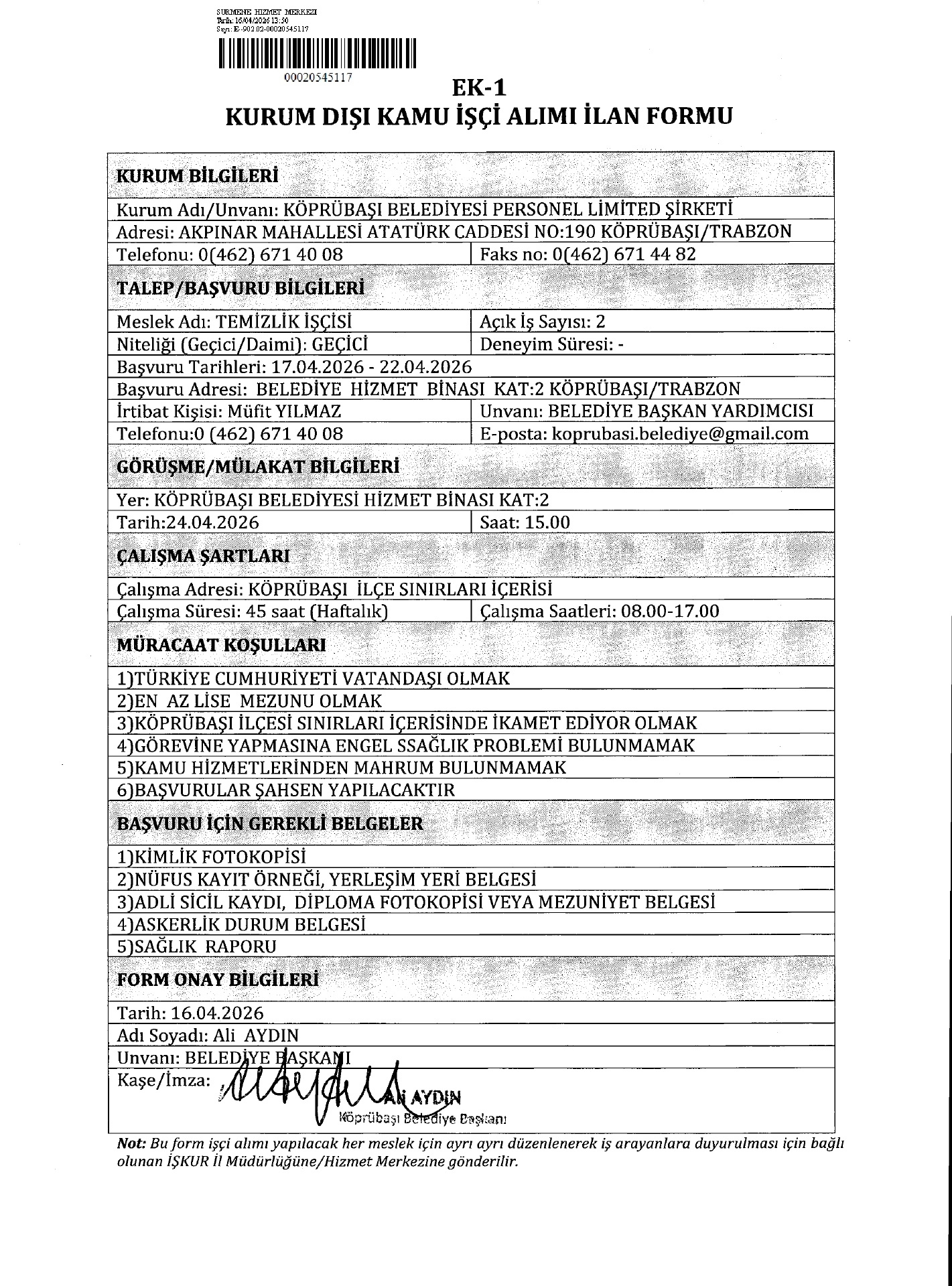 Trabzon Köprübaşı Belediyesi Geçici 2 İşçi Alacak. Son başvuru tarihi 22 Nisan 2026