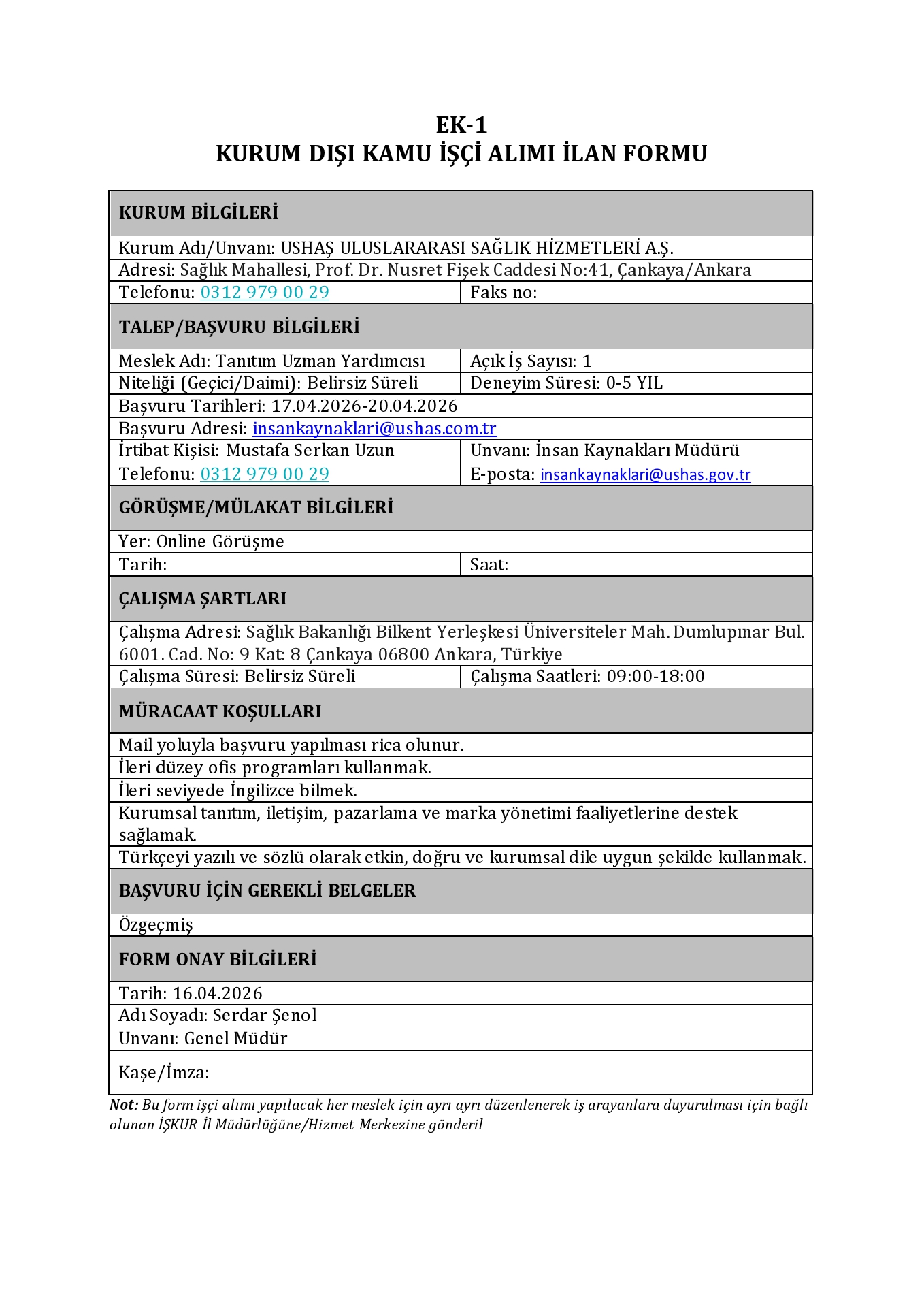 Ana sayfaDaimi İşçi İlanları Ankara Ushaş 1 İşçi Alacak Ankara Ushaş 1 İşçi Alacak. Son başvuru tarihi 20 Nisan 2026 Kaynak : İşkur İlan Giriş : 17 Nisan 2026 23:36, Son Güncelleme : 17 Nisan 2026 23:31 Yazdır Yorumlar (0) Abone Ol