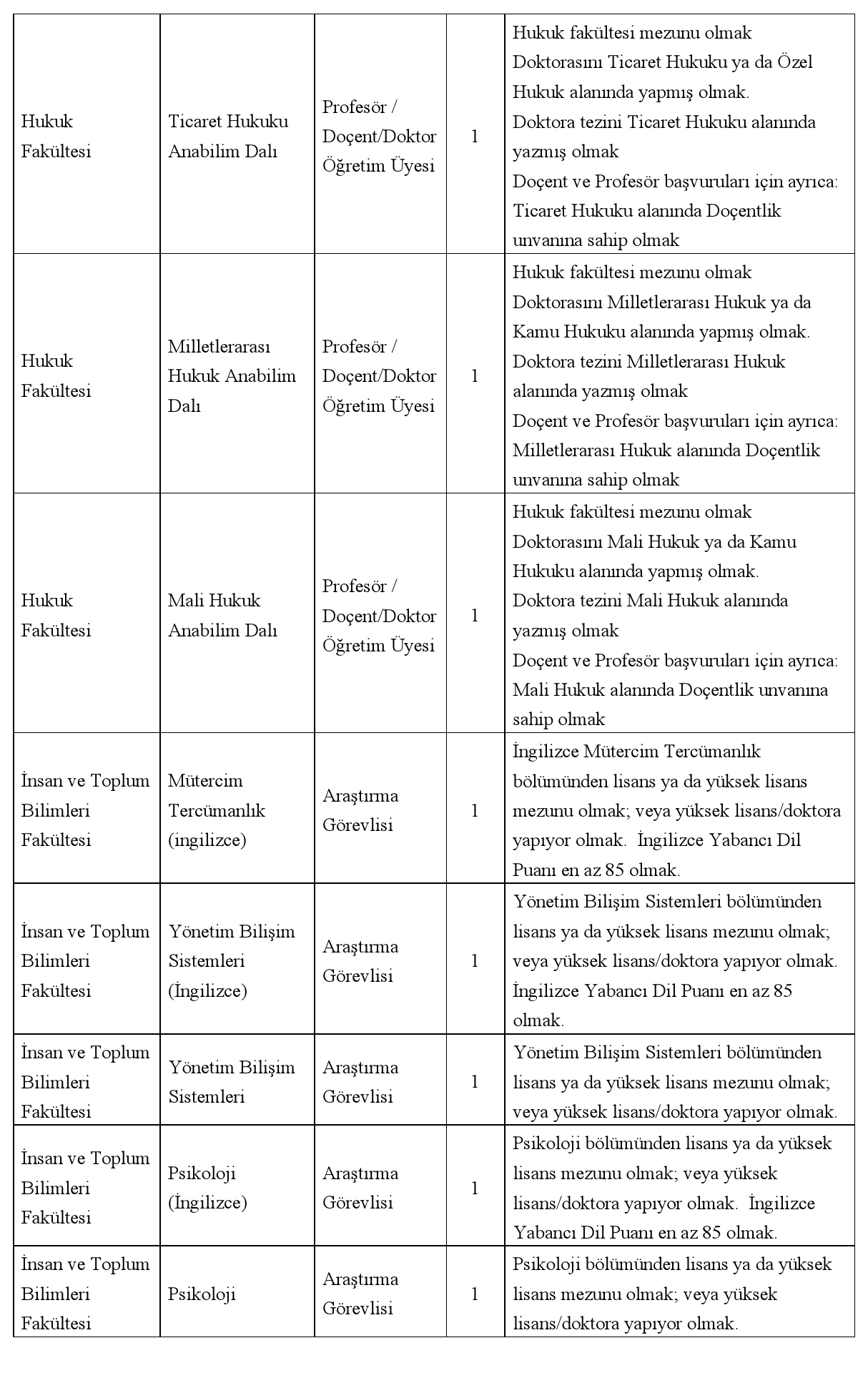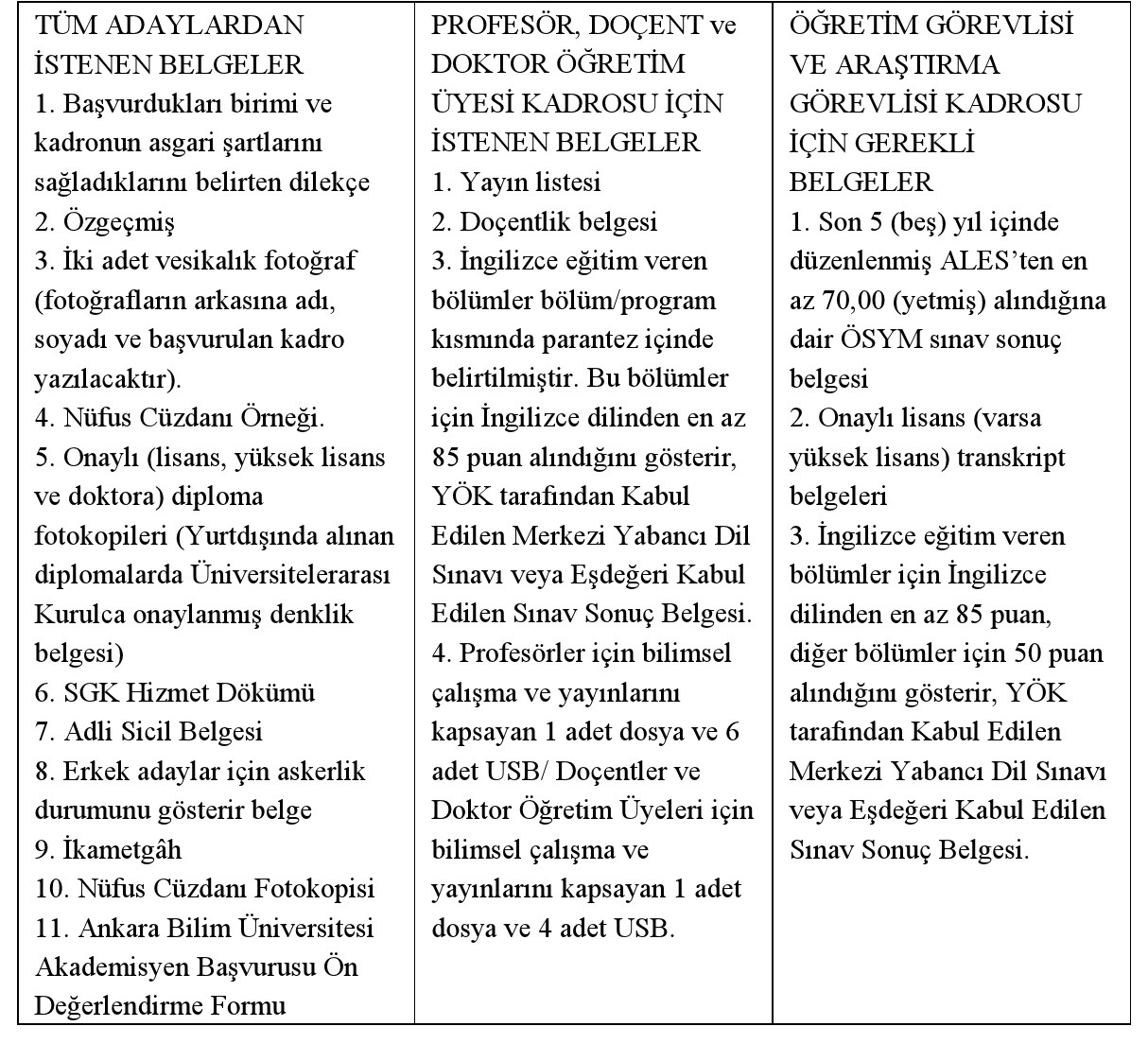 Üniversitemize; 2547 sayılı Yüksek Öğretim Kanunu, Öğretim Üyeliğine Yükseltilme ve Atanma Yönetmeliği ve Ankara Bilim Üniversitesi Akademik Yükseltilme ve Atama Kriterleri Yönergesinde aranan koşulları yerine getirmiş olmak kaydı ile aylık ve özlük hakları yönünden 4857 sayılı İş Kanunu hükümlerine tabi olarak aşağıda belirtilen bölümlere öğretim elemanları alınacaktır. İlana konu olan kadrolar tam zamanlıdır. Müracaat edecek adayların ilgili yönetmelik ve yönerge hükümlerinde belirtilen asgari başvuru koşullarını sağlamaları ve aşağıda istenilen belgeler ile birlikte Ankara Bilim Üniversitesi Rektörlüğüne şahsen veya posta yoluyla başvurmaları gerekmektedir. Başvuru süreci Resmi Gazete yayım tarihinden itibaren 15 (on beş) gündür.