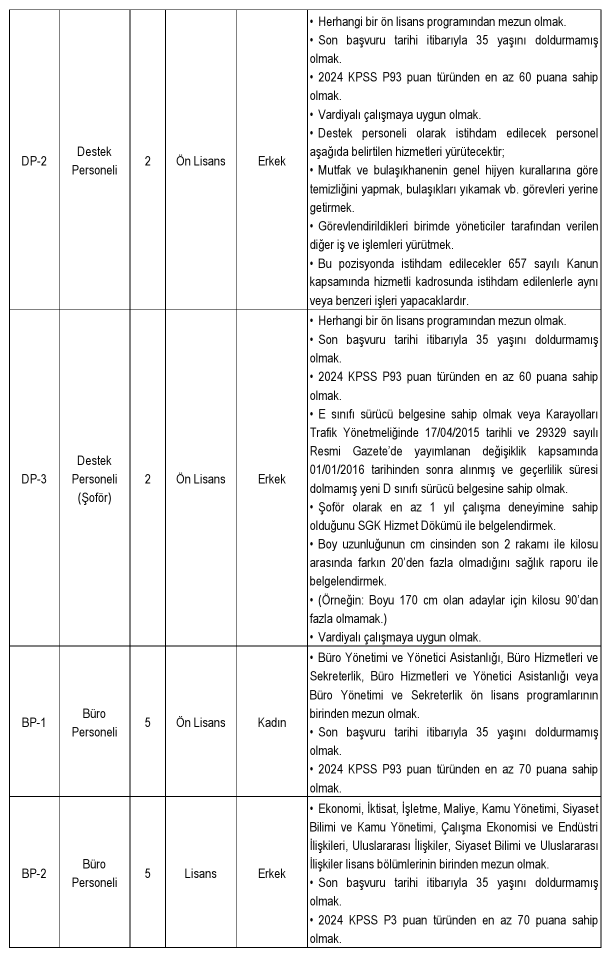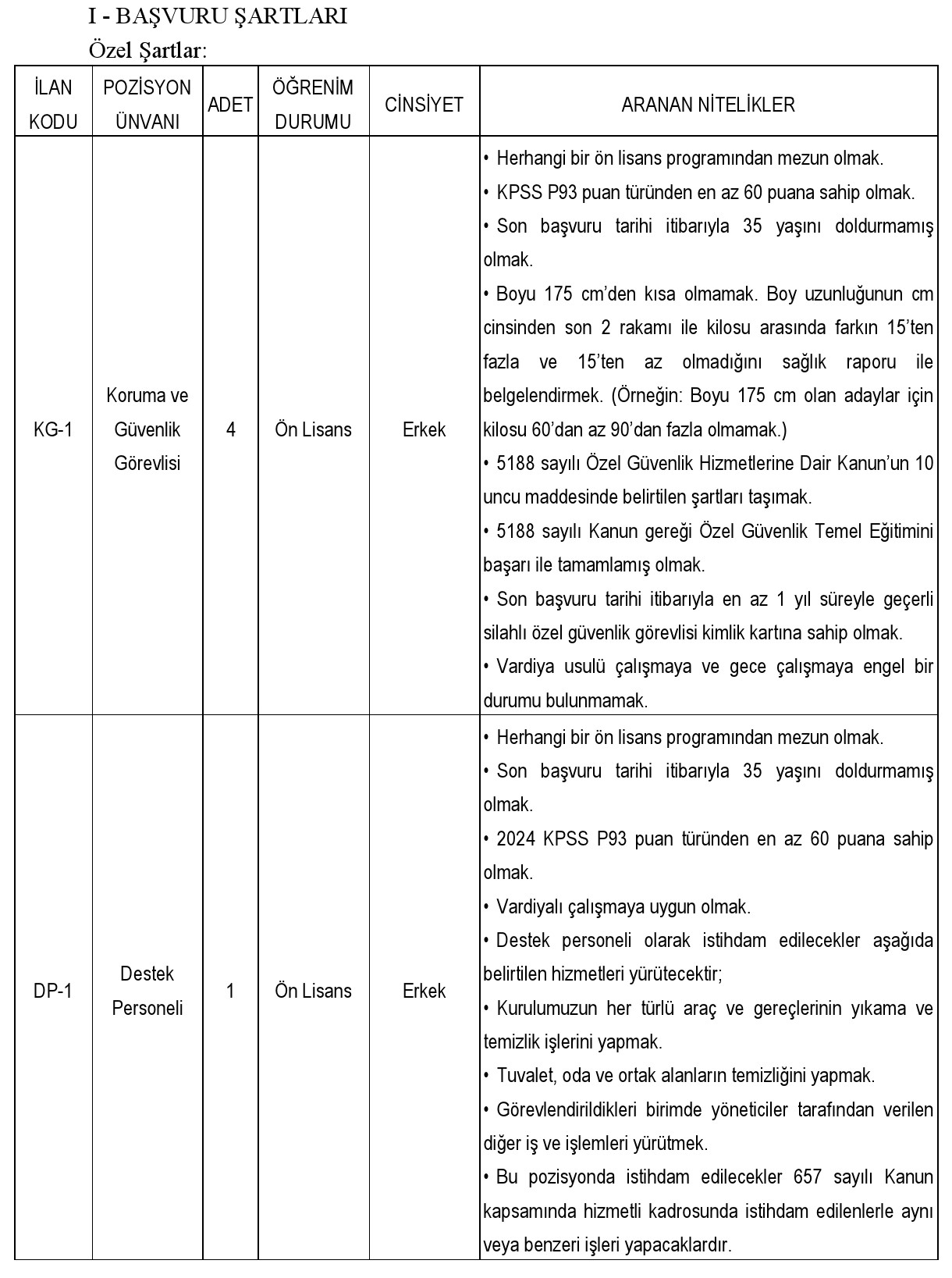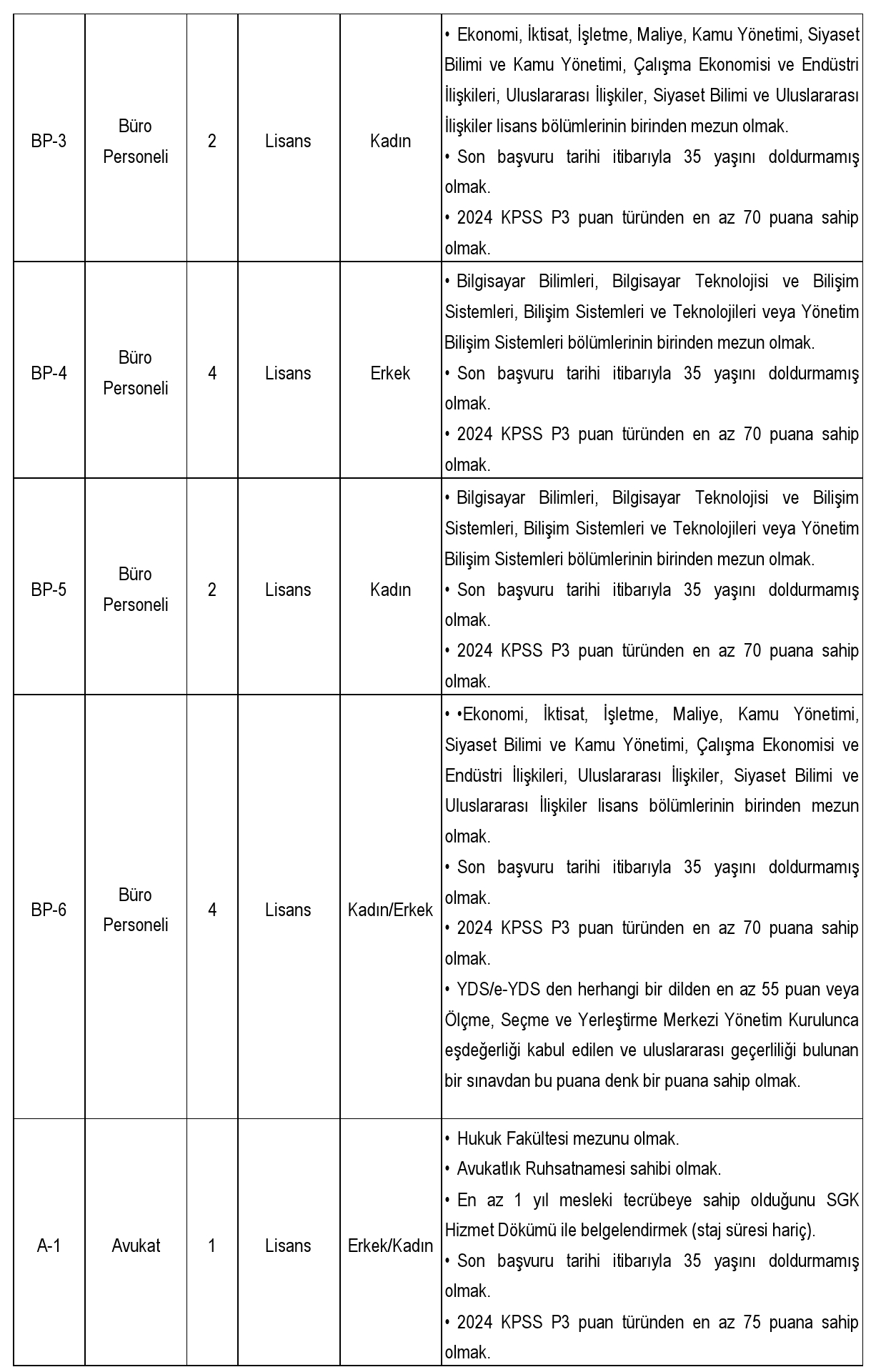 Adayların ilgili pozisyona göre değişmekle birlikte en az 60 veya 70 KPSS puanına sahip olması gerekiyor. Avukat kadrosu için bu baraj 75 puan olarak belirlendi. Ayrıca tüm adaylar için 35 yaş sınırı, ilgili mezuniyet şartı ve bazı kadrolar için deneyim, sertifika veya fiziksel yeterlilik gibi özel kriterler aranıyor.