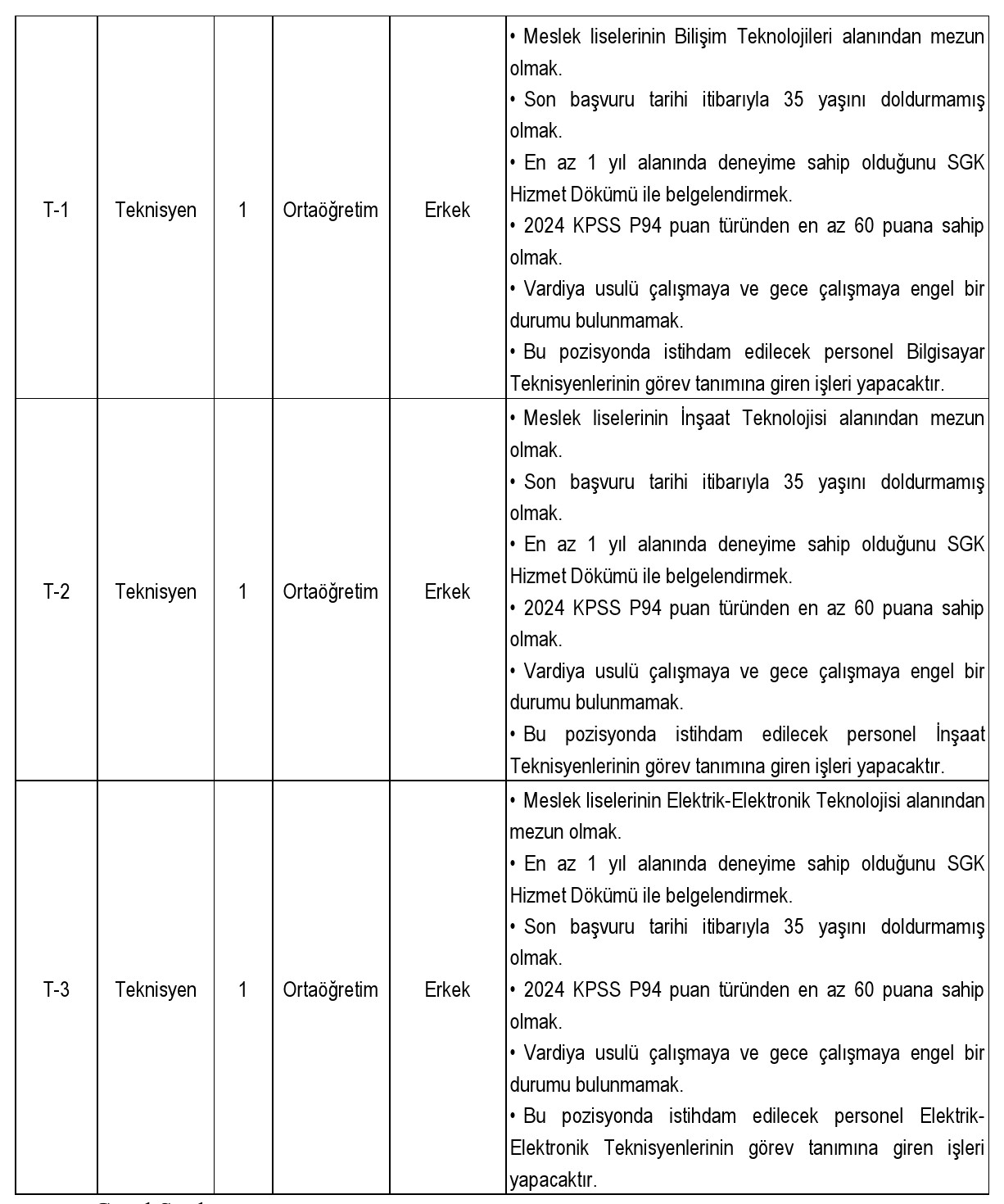 İlanda yer alan bilgilere göre alım yapılacak başlıca kadrolar şu şekilde: