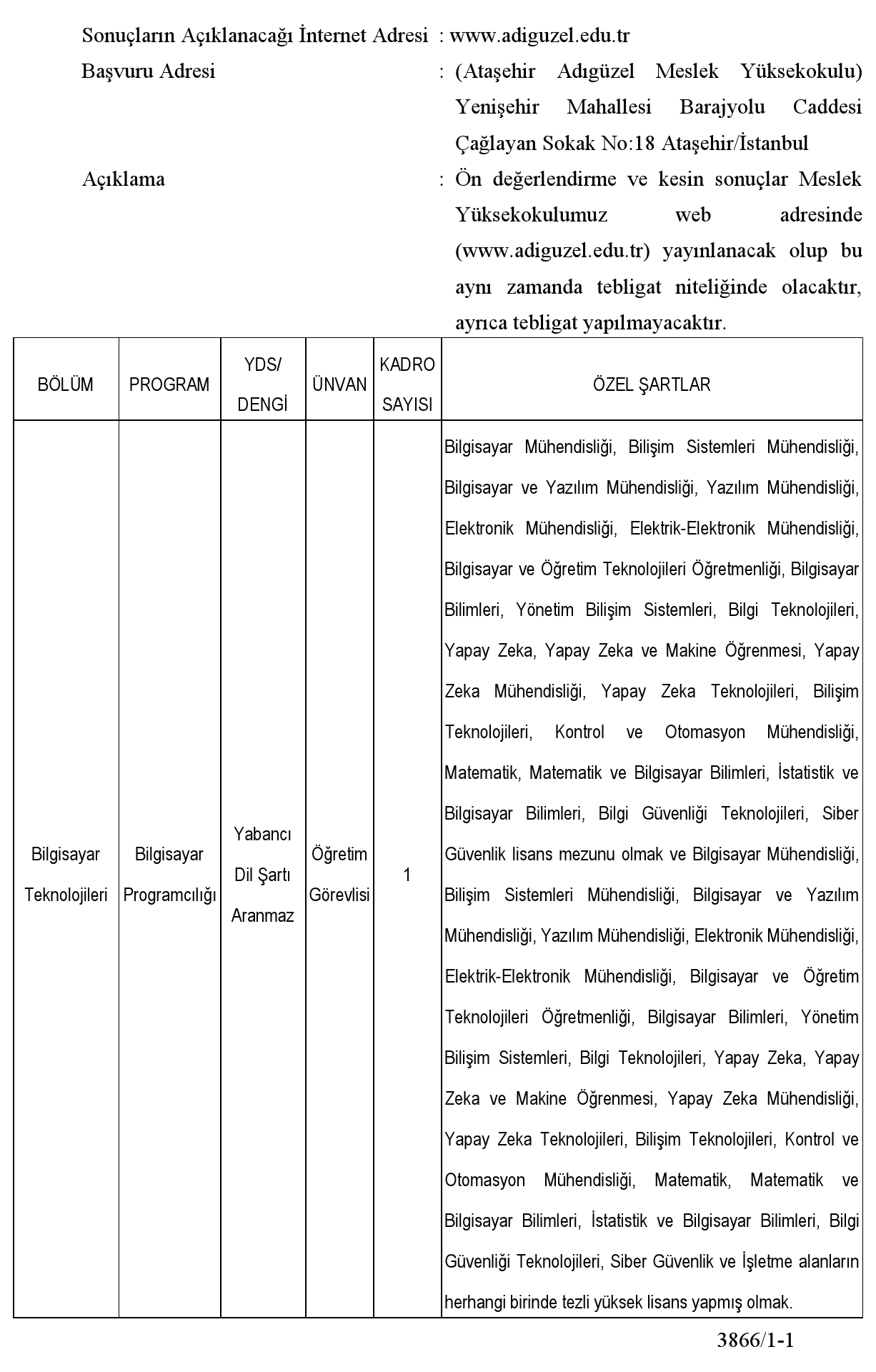 Ataşehir Adıgüzel Meslek Yüksekokulu Öğretim Elemanı Alım İlanı. Son başvuru tarihi 4 Mayıs 2026