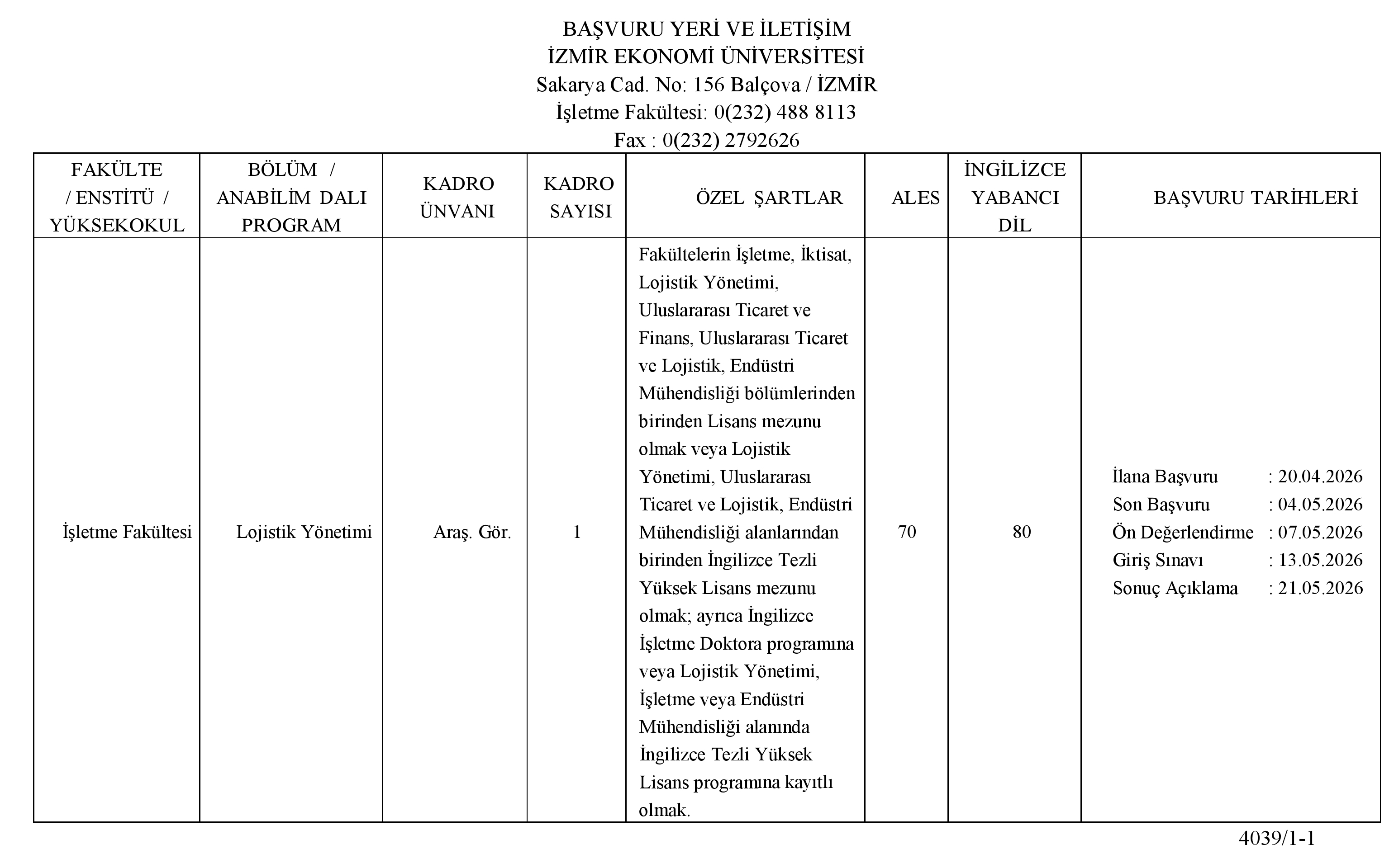 BAŞVURU YERİ VE İLETİŞİM İZMİR EKONOMİ ÜNİVERSİTESİ Sakarya Cad. No: 156 Balçova / İZMİR İşletme Fakültesi: 0(232) 488 8113 Fax : 0(232) 2792626