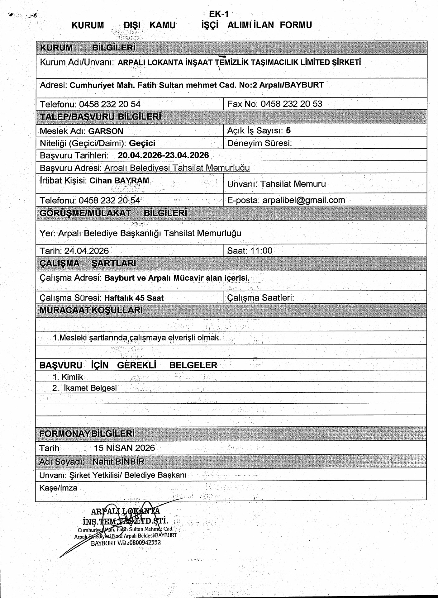 Ana sayfaGeçici İşçi İlanları Bayburt Arpalı Belediyesi Geçici 5 İşçi Alacak Bayburt Arpalı Belediyesi Geçici 5 İşçi Alacak. Son başvuru tarihi 23 Nisan 2026 Kaynak : İşkur İlan Giriş : 20 Nisan 2026 22:32, Son Güncelleme : 20 Nisan 2026 22:40 Yazdır Yorumlar (0) Abone Ol
