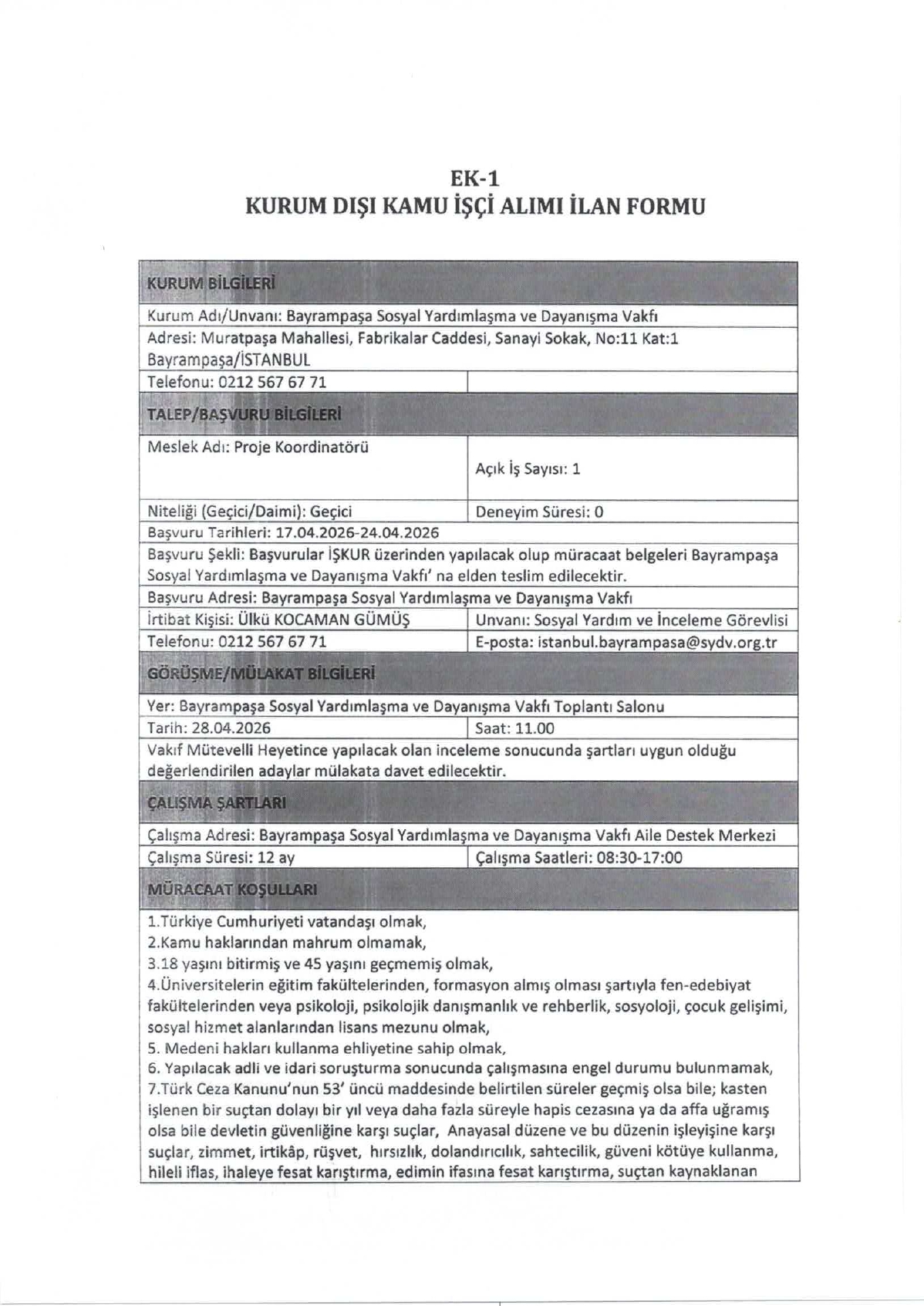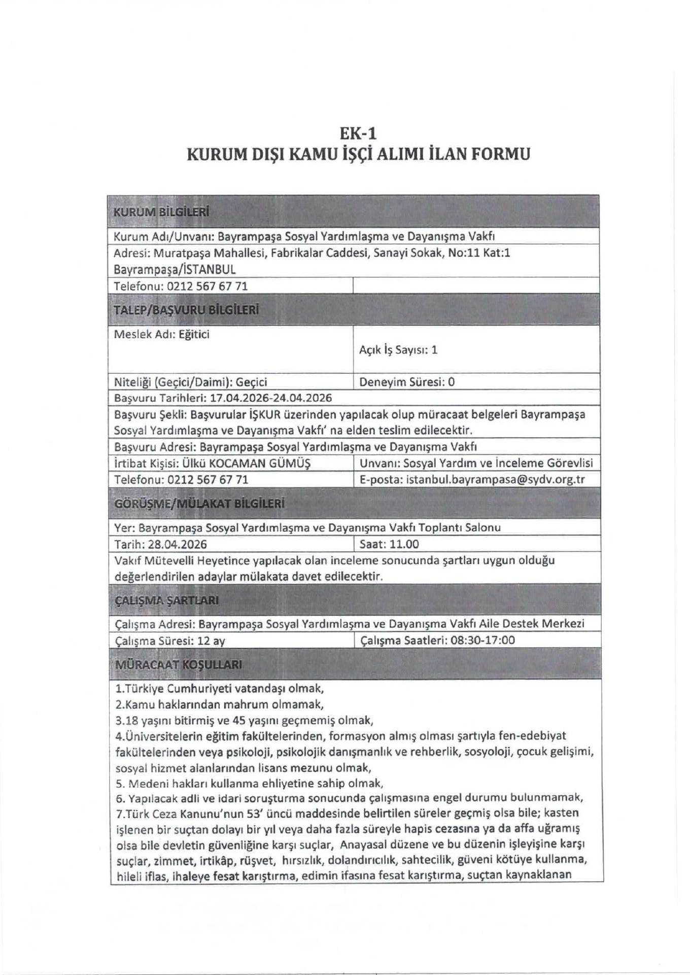Ana sayfaSYDV İlanlarıAna sayfaGeçici İşçi İlanları İstanbul Bayrampaşa SYDV Geçici 2 İşçi Alacak İstanbul Bayrampaşa SYDV Geçici 2 İşçi Alacak. Son başvuru tarihi 24 Nisan 2026 Kaynak : İşkur İlan Giriş : 20 Nisan 2026 22:36, Son Güncelleme : 20 Nisan 2026 22:40 Yazdır Yorumlar (0) Abone Ol