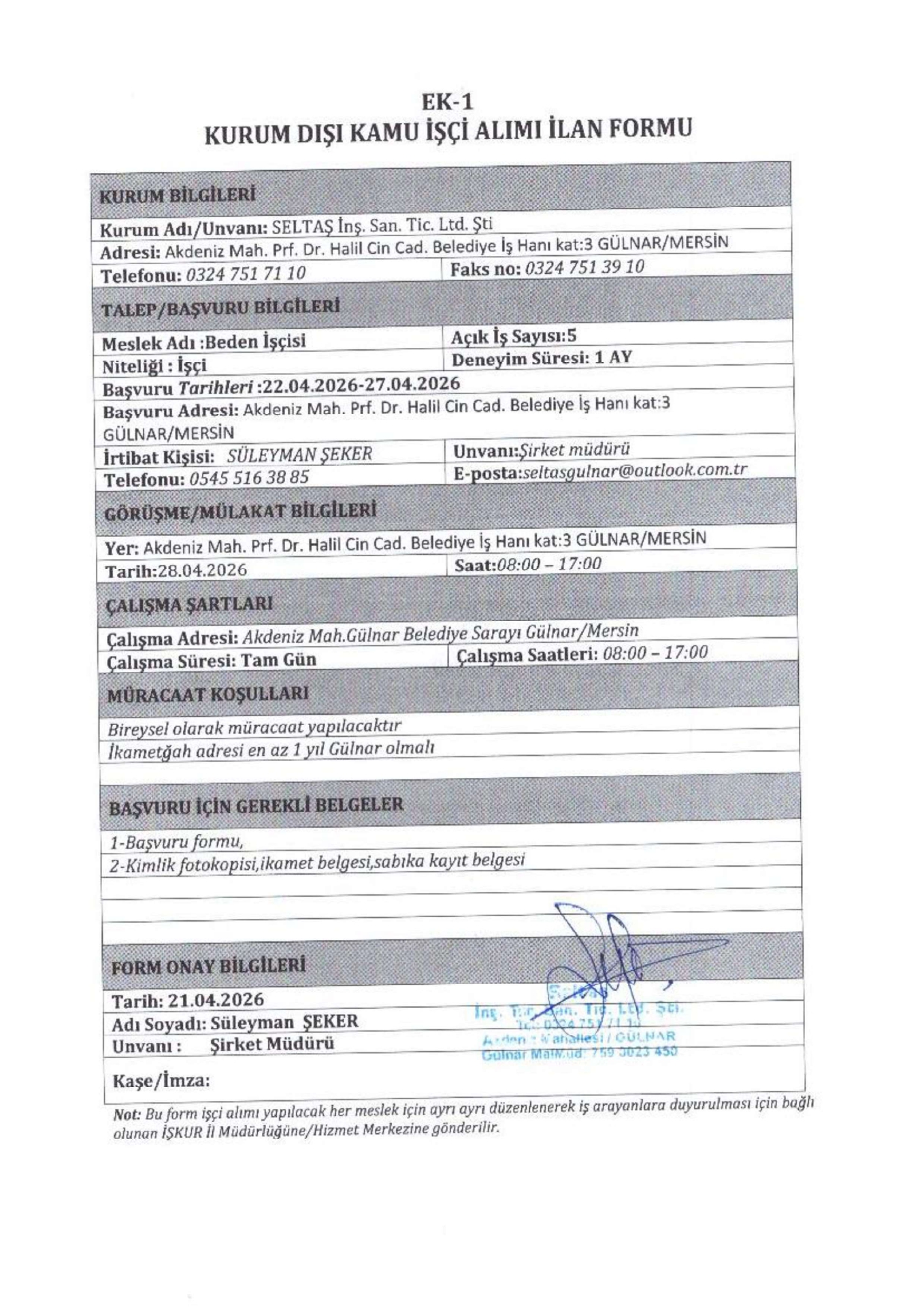 Ana sayfaDaimi İşçi İlanları Mersin Seltaş 5 İşçi Alacak Mersin Seltaş 5 İşçi Alacak. Son başvuru tarihi 27 Nisan 2026 Kaynak : İşkur İlan Giriş : 21 Nisan 2026 22:12, Son Güncelleme : 21 Nisan 2026 22:07 Yazdır Yorumlar (0) Abone Ol