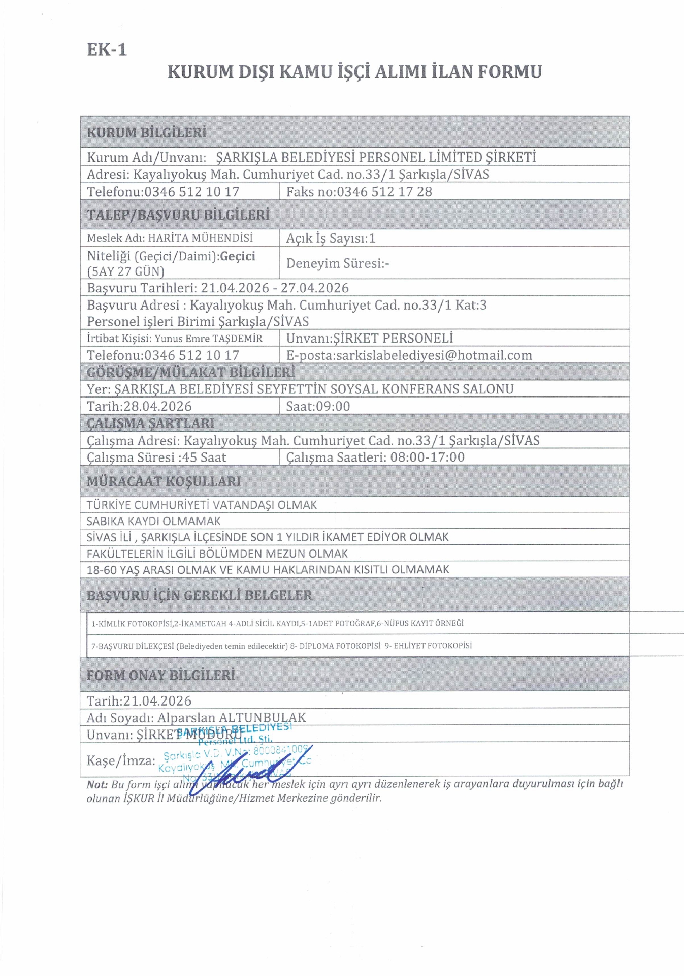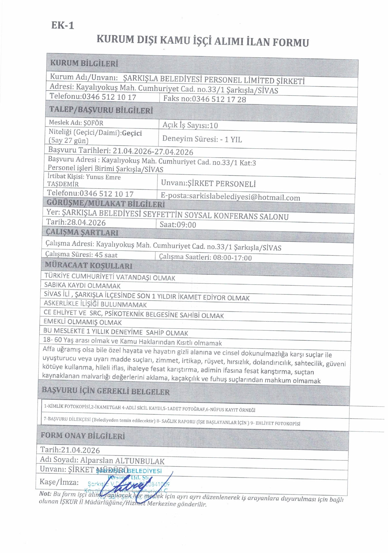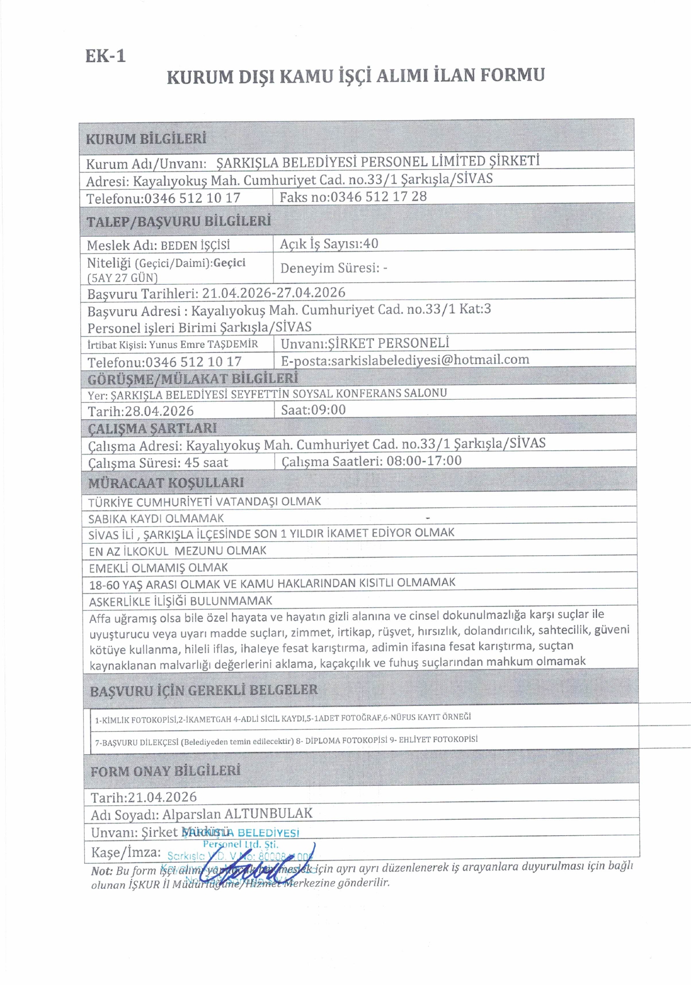 Sivas Şarkışla Belediyesi Geçici 51 İşçi Alacak. Son başvuru tarihi 27 Nisan 2026