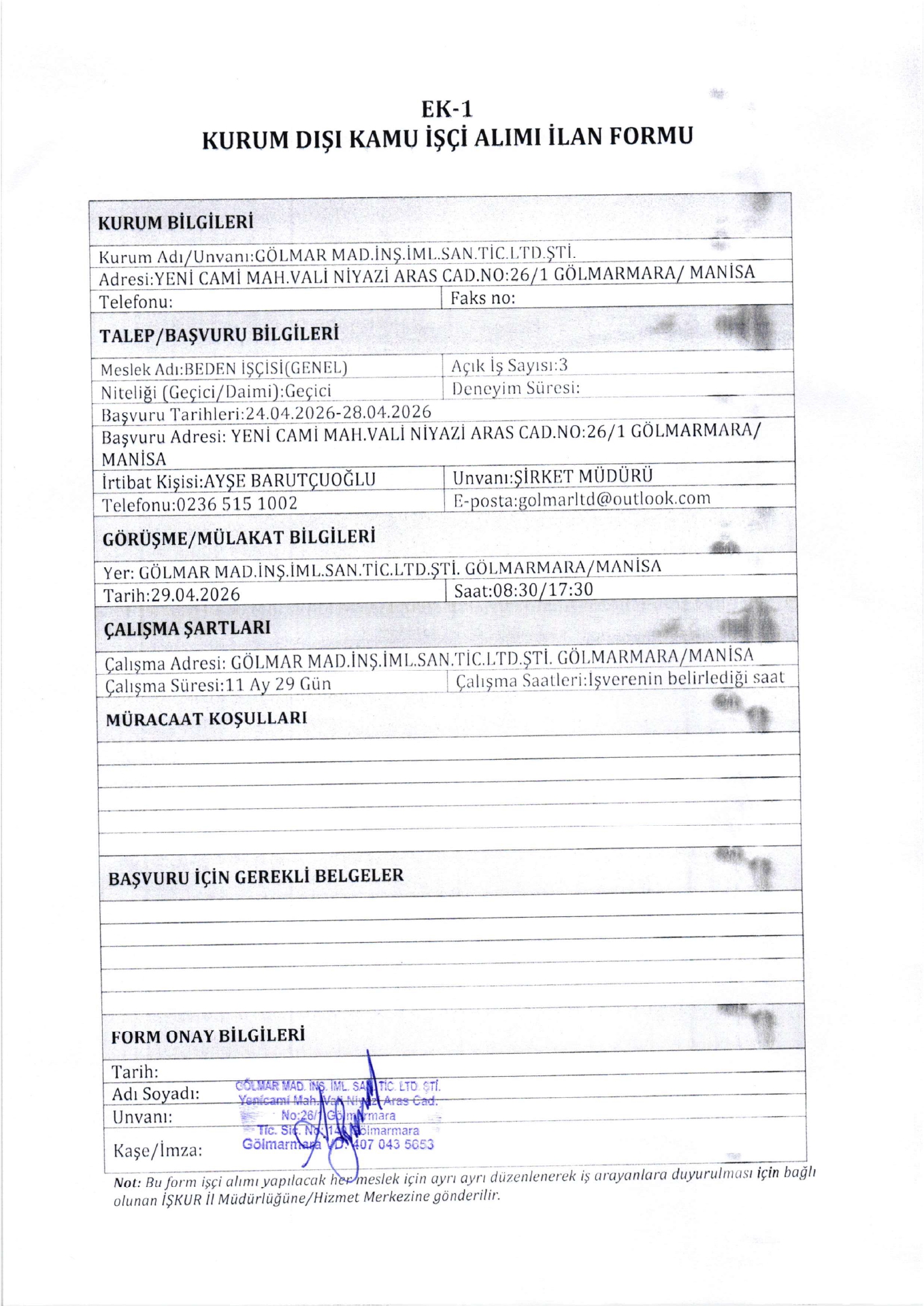 Ana sayfaGeçici İşçi İlanları Manisa Gölmar Geçici 3 İşçi Alacak Manisa Gölmar Geçici 3 İşçi Alacak. Son başvuru tarihi 28 Nisan 2026 Kaynak : İşkur İlan Giriş : 23 Nisan 2026 02:22, Son Güncelleme : 23 Nisan 2026 02:21 Yazdır Yorumlar (0) Abone Ol