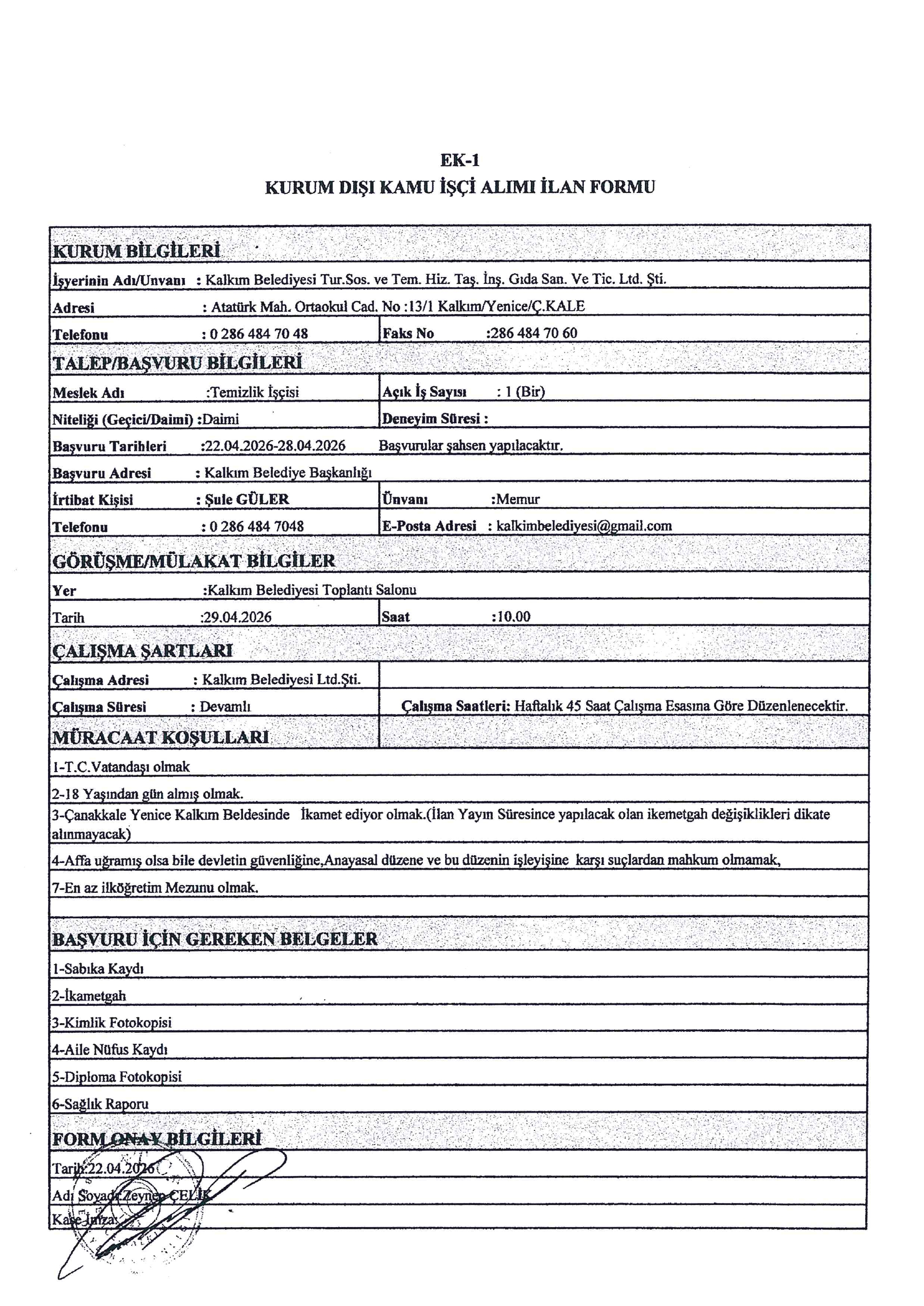 Çanakkale Kalkım Belediyesi 1 İşçi Alacak. Son başvuru tarihi 28 Nisan 2026