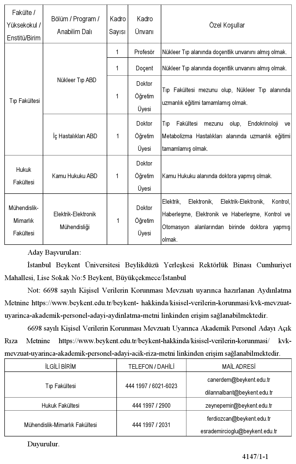 Üniversitemize 2547 sayılı Yükseköğretim Kanunu ve "Öğretim Üyeliğine Yükseltilme ve Atanma Yönetmeliği" ile "İstanbul Beykent Üniversitesi Öğretim Üyeliğine Yükseltme ve Atama Yönergesi" (https://www.beykent.edu.tr/yonetmelikler-yonergeler/yonergeler) hükümlerinde aranan koşulları yerine getirmiş olmak kaydı ile aylık ve özlük hakları yönünden 4857 sayılı İş Kanunu hükümlerine tabi Tıp Fakültesi, Hukuk Fakültesi ve Mühendislik-Mimarlık Fakültesi bünyesinde çeşitli alanlarda; 6 Öğretim Üyesi alınacaktır. İlana konu olan kadrolar tam zamanlıdır.