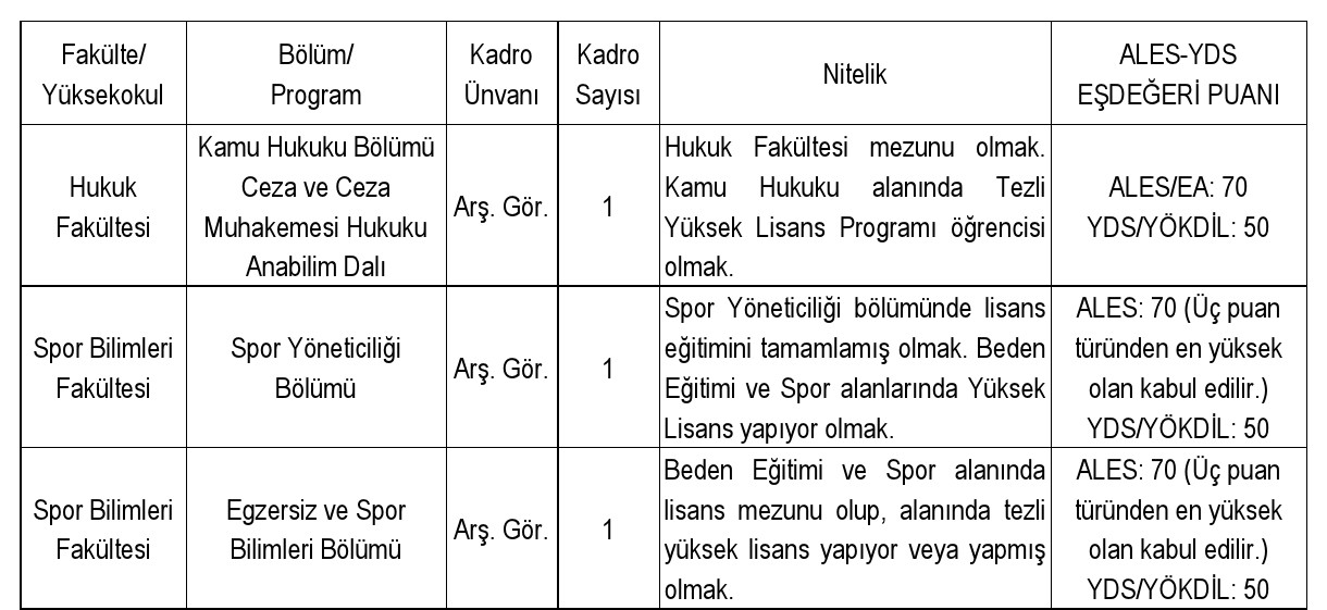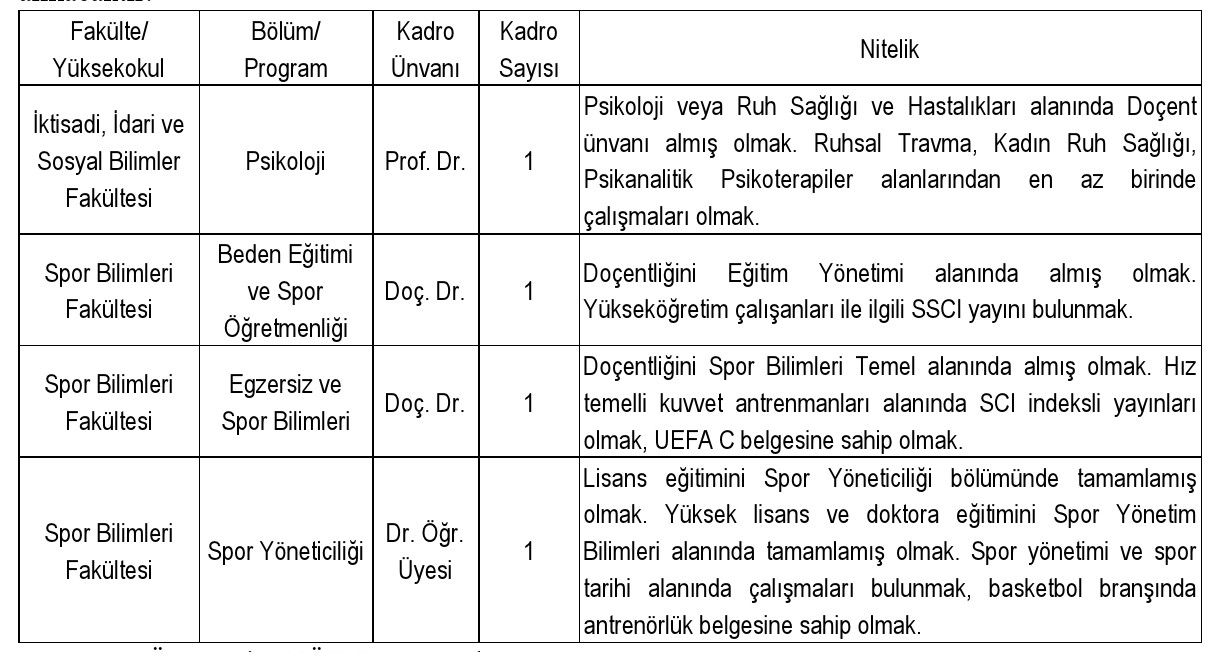 Üniversitemize 2547 sayılı Yükseköğretim Kanunu'nun ve Öğretim Üyesi Dışındaki Öğretim Elemanı Kadrolarına Yapılacak Atamalarda uygulanacak Merkezi Sınav ile Giriş Sınavlarına İlişkin Usul ve Esaslar Hakkında Yönetmelik gereğince öngörülen koşulları sağlamış olmak şartı ile aşağıda belirtilen kadrolara öğretim elemanı alınacaktır.