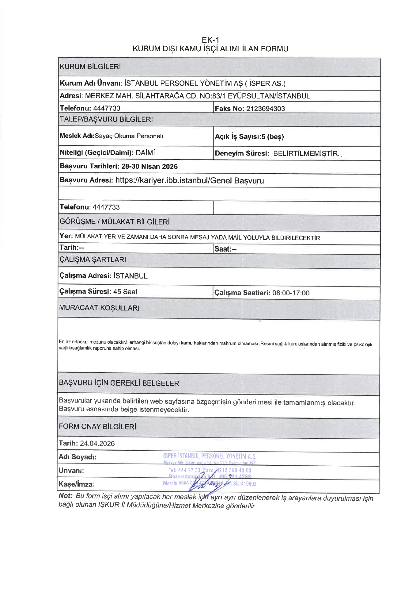 Ana sayfaDaimi İşçi İlanları İstanbul Personel Yönetim Aş. 5 İşçi Alacak İstanbul Personel Yönetim Aş. 5 İşçi Alacak. Son başvuru tarihi 30 Nisan 2026 Kaynak : İşkur İlan Giriş : 28 Nisan 2026 00:29, Son Güncelleme : 28 Nisan 2026 00:57 Yazdır Yorumlar (0) Abone Ol