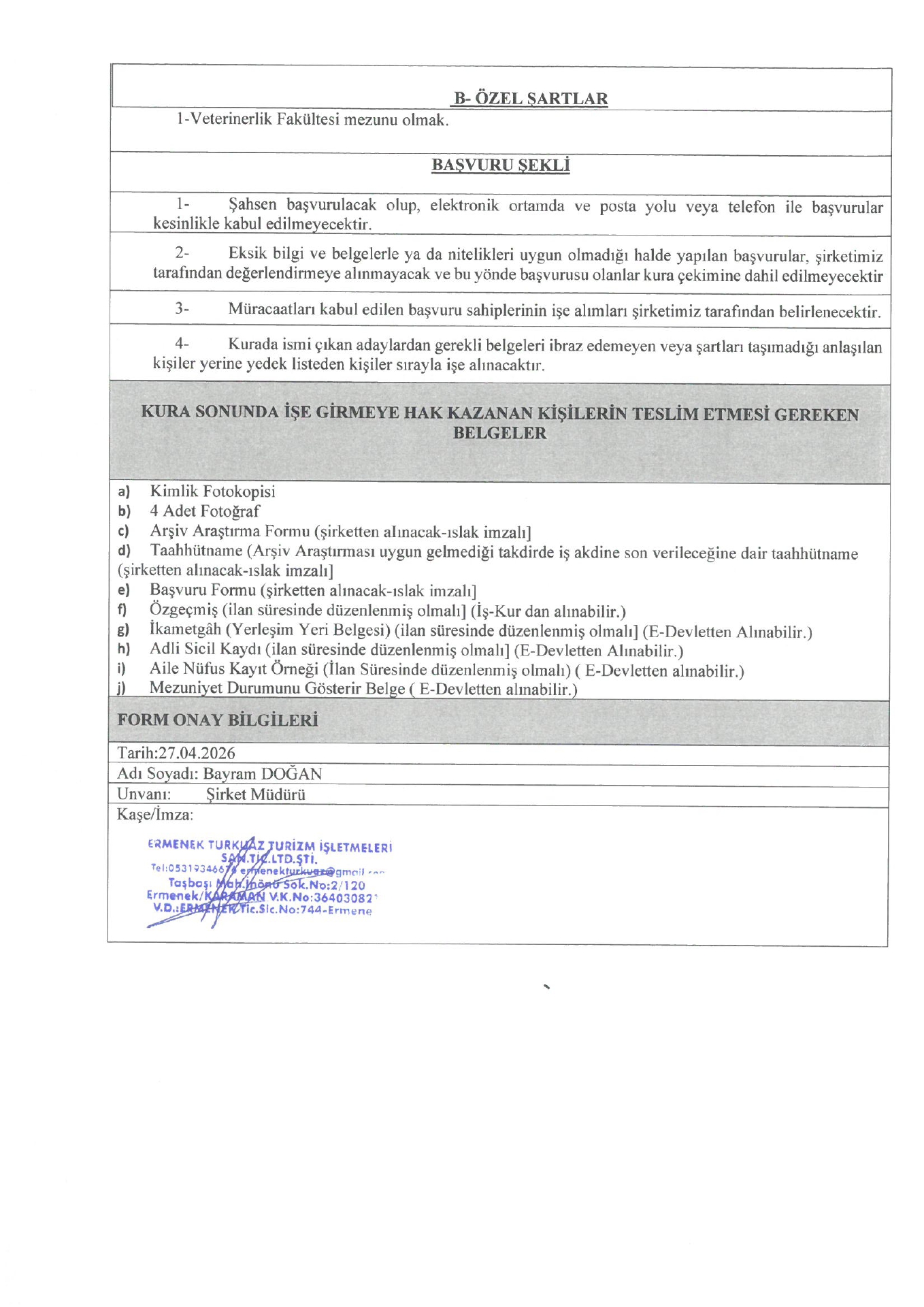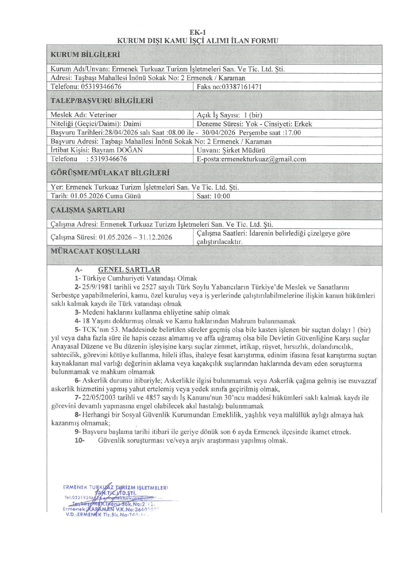 Ana sayfaDaimi İşçi İlanları Karaman Ermenek Turkuaz 1 İşçi Alacak Karaman Ermenek Turkuaz 1 İşçi Alacak. Son başvuru tarihi 30 Nisan 2026 Kaynak : İşkur İlan Giriş : 28 Nisan 2026 00:33, Son Güncelleme : 28 Nisan 2026 00:56 Yazdır Yorumlar (0) Abone Ol