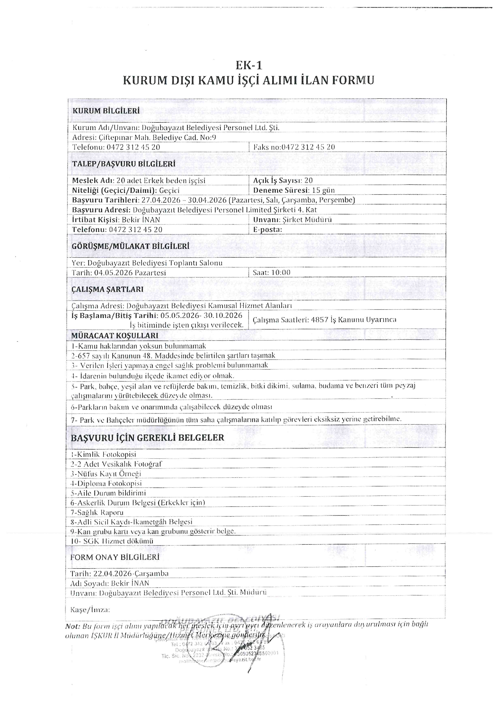 Ana sayfaGeçici İşçi İlanları Ağrı Doğubeyazıt Belediyesi Geçici 20 İşçi Alacak Ağrı Doğubeyazıt Belediyesi Geçici 20 İşçi Alacak. Son başvuru tarihi 30 Nisan 2026 Kaynak : İşkur İlan Giriş : 28 Nisan 2026 00:42, Son Güncelleme : 28 Nisan 2026 00:54 Yazdır Yorumlar (0) Abone Ol
