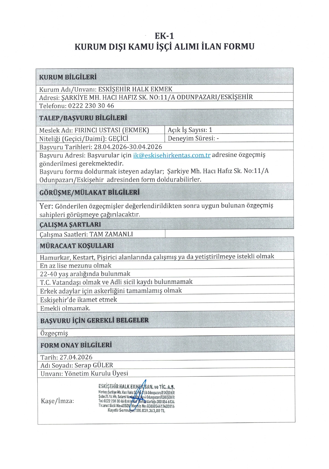 Ana sayfaGeçici İşçi İlanları Eskişehir Halk Ekmek Geçici 1 İşçi Alacak Eskişehir Halk Ekmek Geçici 1 İşçi Alacak. Son başvuru tarihi 30 Nisan 2026 Kaynak : İşkur İlan Giriş : 29 Nisan 2026 00:38, Son Güncelleme : 29 Nisan 2026 01:17 Yazdır Yorumlar (0) Abone Ol