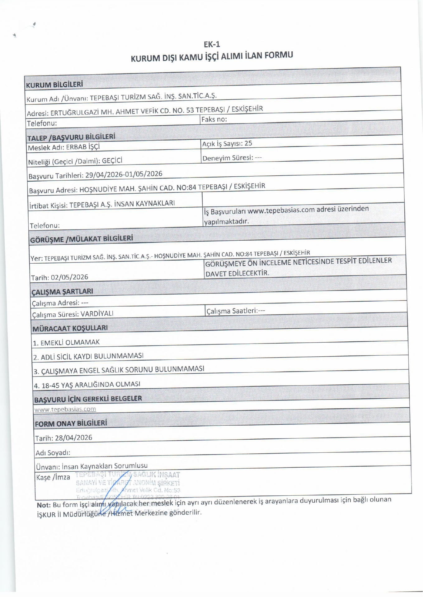 Eskişehir Tepebaşı Turizm Geçici 25 İşçi Alacak. Son başvuru tarihi 1 Mayıs 2026