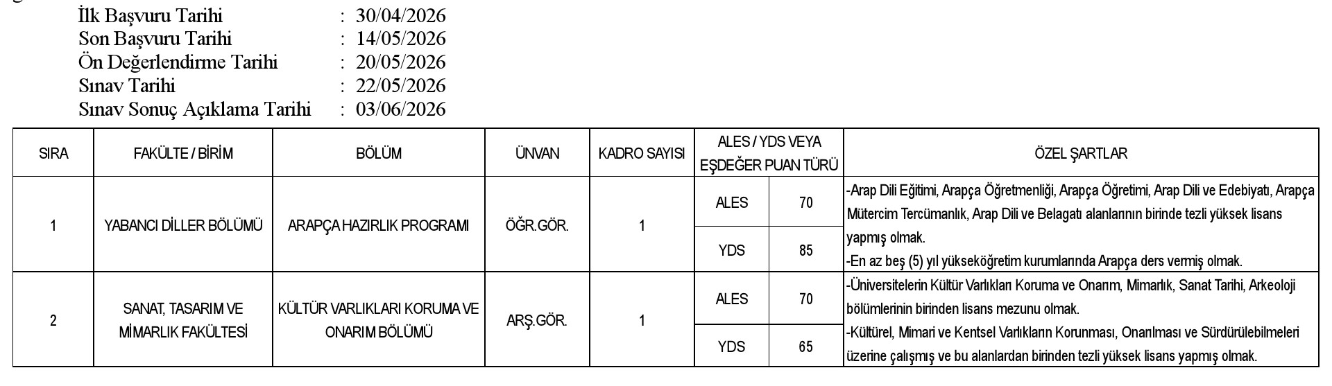 14/05/2026 tarihleri arasında Rektörlüğümüz İnsan Kaynakları Direktörlüğü'ne şahsen veya posta yoluyla başvurmaları